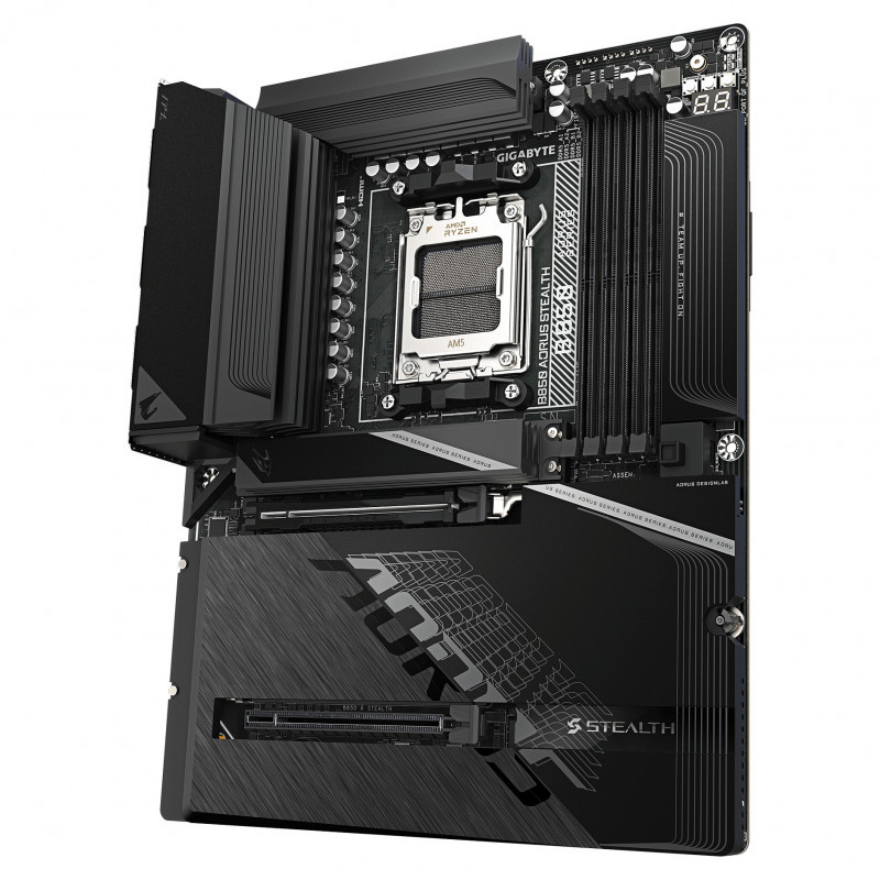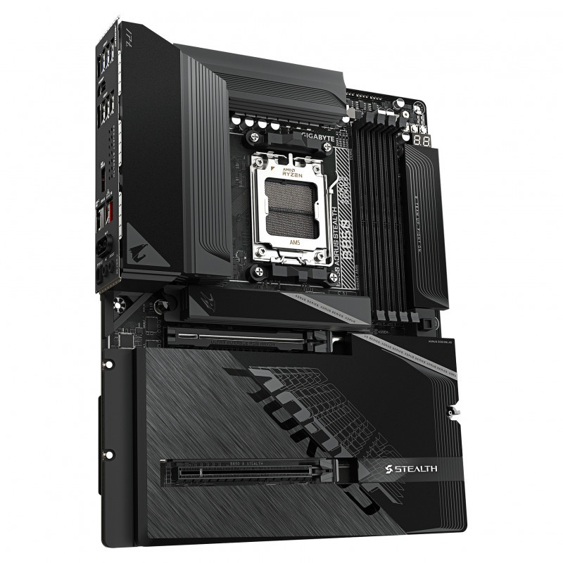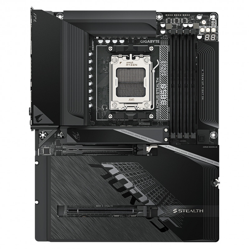 "GIGABYTE B850 AORUS STEALTH Motherboard - AMD Ryzen 9000 Series CPUs, 14+2+2 Phases Digital VRM, up to 8200MHz DDR5 (OC), 2xPCIe 5.0 + 2xPCIe 4.0 M.2, WIFI 7, 5 GbE LAN, USB 3.2 Gen 2. Processor manufacturer: AMD, Processor socket: Socket AM5, Compatible processor series: AMD Ryzen 7000 Series, AMD Ryzen 8000 Series, AMD Ryzen 9000 Series. Supported memory types: DDR5-SDRAM, Maximum internal memory: 256 GB, Memory slots type: DIMM. Supported storage drive interfaces: M.2, PCI Express 4.0, PCI Express 5.0, SATA III, Supported storage drive types: HDD & SSD, RAID levels: 0, 1, 5, 10. Maximum resolution: 4096 x 2160 pixels. Ethernet interface type: 5 Gigabit Ethernet, 2.5 Gigabit Ethernet, Gigabit Ethernet, Fast Ethernet, LAN controller: Realtek RTL8126, Top Wi-Fi standard: Wi-Fi 7 (802.11be)"\n"Elevate your computing experience with GIGABYTE's renowned motherboard series: AORUS, AERO, and GIGABYTE. Featuring innovative designs and advanced features, these boards offer exceptional performance and reliability. Whether you're a gamer, content creator, or professional, our series cater to your needs, ensuring uncompromising quality and cutting-edge technology."