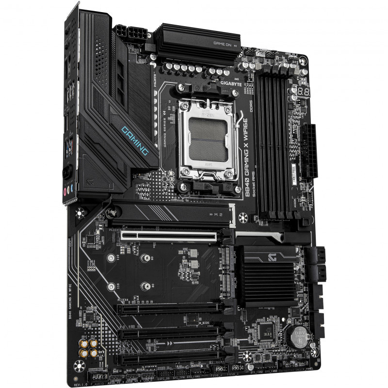 "GIGABYTE B840 GAMING X WIFI6E Motherboard - AMD Ryzen 9000 CPUs, 12+2+2 Phases VRM, up to 7600MHz DDR5(O.C), 2xPCIe 4.0 + 1xPCIe 3.0 M.2, Wi-Fi 6E, 2.5GbE LAN, USB 3.2 Gen 2. Processor manufacturer: AMD, Processor socket: Socket AM5, Compatible processor series: AMD Ryzen 7000 Series, AMD Ryzen 8000 Series, AMD Ryzen 9000 Series. Supported memory types: DDR5-SDRAM, Maximum internal memory: 256 GB, Memory slots type: DIMM. Supported storage drive interfaces: M.2, PCI Express 3.0, PCI Express 4.0, SATA III, Supported storage drive types: HDD & SSD, RAID levels: 0, 1, 5, 10. Maximum resolution: 4096 x 2160 pixels. Ethernet interface type: 2.5 Gigabit Ethernet, LAN controller: Realtek RTL8125, Top Wi-Fi standard: Wi-Fi 6E (802.11ax)"\n"Elevate your computing experience with GIGABYTE's renowned motherboard series: AORUS, AERO, and GIGABYTE. Featuring innovative designs and advanced features, these boards offer exceptional performance and reliability. Whether you're a gamer, content creator, or professional, our series cater to your needs, ensuring uncompromising quality and cutting-edge technology."