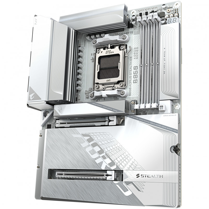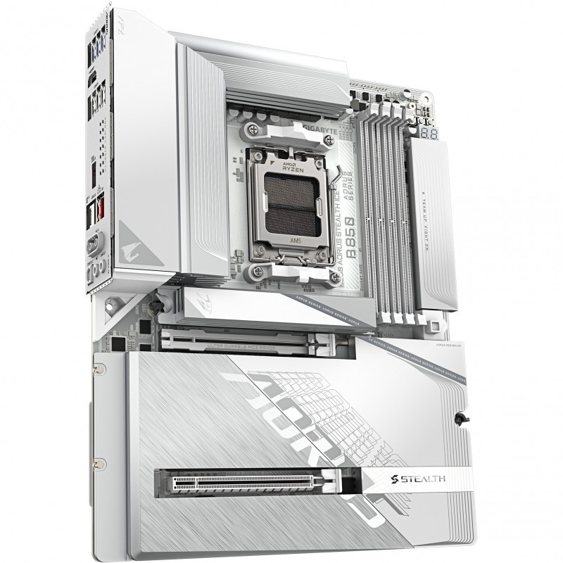 "GIGABYTE B850 AORUS STEALTH ICE Motherboard - AMD Ryzen 9000 Series CPUs, 14+2+2 Phases Digital VRM, up to 8200MHz DDR5 (OC), 2xPCIe 5.0 + 2xPCIe 4.0 M.2, WIFI 7, 5 GbE LAN, USB 3.2 Gen 2. Processor manufacturer: AMD, Processor socket: Socket AM5, Compatible processor series: AMD Ryzen 7000 Series, AMD Ryzen 8000 Series, AMD Ryzen 9000 Series. Supported memory types: DDR5-SDRAM, Maximum internal memory: 256 GB, Memory slots type: DIMM. Supported storage drive interfaces: M.2, PCI Express 4.0, PCI Express 5.0, SATA III, Supported storage drive types: HDD & SSD, RAID levels: 0, 1, 5, 10. Maximum resolution: 4096 x 2160 pixels. Ethernet interface type: 5 Gigabit Ethernet, LAN controller: Realtek RTL8126, Top Wi-Fi standard: Wi-Fi 7 (802.11be)"\n"Elevate your computing experience with GIGABYTE's renowned motherboard series: AORUS, AERO, and GIGABYTE. Featuring innovative designs and advanced features, these boards offer exceptional performance and reliability. Whether you're a gamer, content creator, or professional, our series cater to your needs, ensuring uncompromising quality and cutting-edge technology."