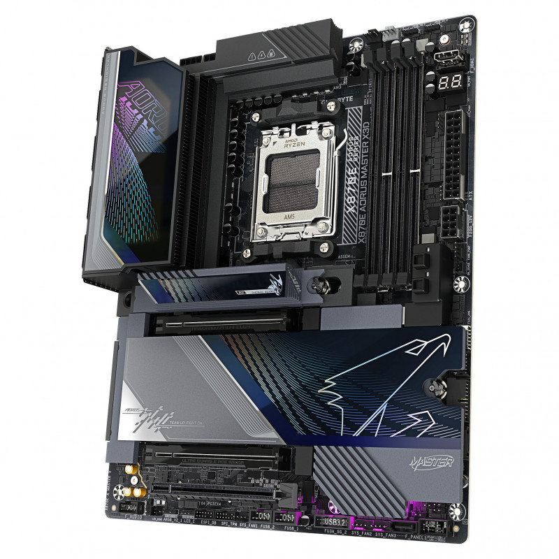 "GIGABYTE X870E AORUS MASTER X3D Motherboard - Supports AMD Ryzen 9000 CPUs, 18+2+2 Phases Digital VRM, up to 9000Hz DDR5 (OC), 2xPCIe 5.0 + 3xPCIe 4.0, Wi-Fi 7, 10GbE LAN, USB 4. Processor manufacturer: AMD, Processor socket: Socket AM5, Compatible processor series: AMD Ryzen 7000 Series, AMD Ryzen 8000 Series, AMD Ryzen 9000 Series. Supported memory types: DDR5-SDRAM, Maximum internal memory: 256 GB, Memory slots type: DIMM. Supported storage drive interfaces: M.2, PCI Express 4.0, PCI Express 5.0, SATA III, Supported storage drive types: HDD & SSD, RAID levels: 0, 1, 5, 10. Maximum resolution: 4096 x 2304 pixels. Ethernet interface type: 2.5 Gigabit Ethernet, 5 Gigabit Ethernet, 10 Gigabit Ethernet, Fast Ethernet, Gigabit Ethernet, LAN controller: Realtek RTL8126, Realtek RTL8127, Top Wi-Fi standard: Wi-Fi 7 (802.11be)"\n"Elevate your computing experience with GIGABYTE's renowned motherboard series: AORUS, AERO, and GIGABYTE. Featuring innovative designs and advanced features, these boards offer exceptional performance and reliability. Whether you're a gamer, content creator, or professional, our series cater to your needs, ensuring uncompromising quality and cutting-edge technology."