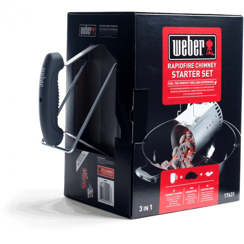 "Weber 17631. Type: Barbecue set, Product colour: Silver, Brand compatibility: Weber. Width: 205.7 mm, Depth: 322.6 mm, Height: 317.5 mm. Quantity per pack: 1 pc(s)"\n"Relax while you’re firing up the barbecue for this special night. With the rapidfire chimney starter set you have everything that you need in order to get the barbecue started. Fill the chimney starter with briquettes and soon after you'll hear the mesmerising crackling that means a great meal is only moments away. It's time to get barbecuing!