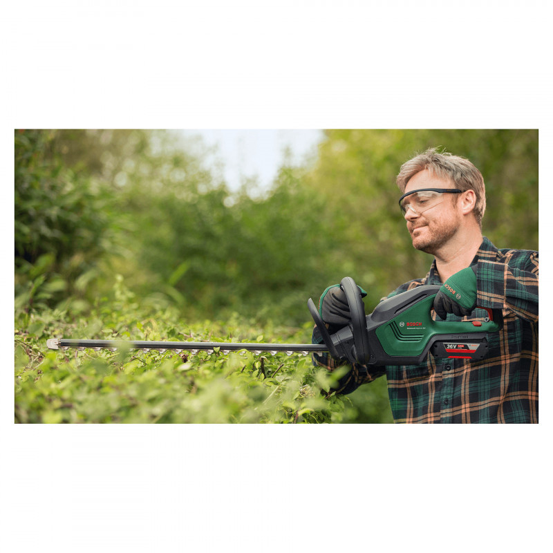 "Bosch AdvancedHedgeCut 36V-65-28. Blade size: 65 cm, Blade type: Single blade, Uncertainty K: 1.5 m/s². Power source: Battery, Battery voltage: 36 V, Battery capacity: 2 Ah. Weight: 3.5 kg, Width: 240 mm, Depth: 1185 mm"\n