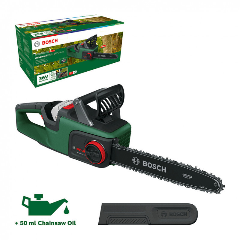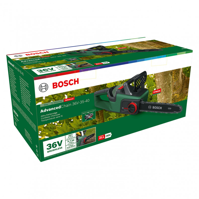 "Bosch AdvancedChain 36V-35-40. Cutting length: 31 cm, Chain bar length: 35 cm, Chain speed: 14 m/s. Power source: Battery, Battery capacity: 2 Ah, Battery voltage: 36 V. Width: 233 mm, Height: 787 mm, Length: 229 mm"\n"High-powered cordless wood cutting with zero emissions