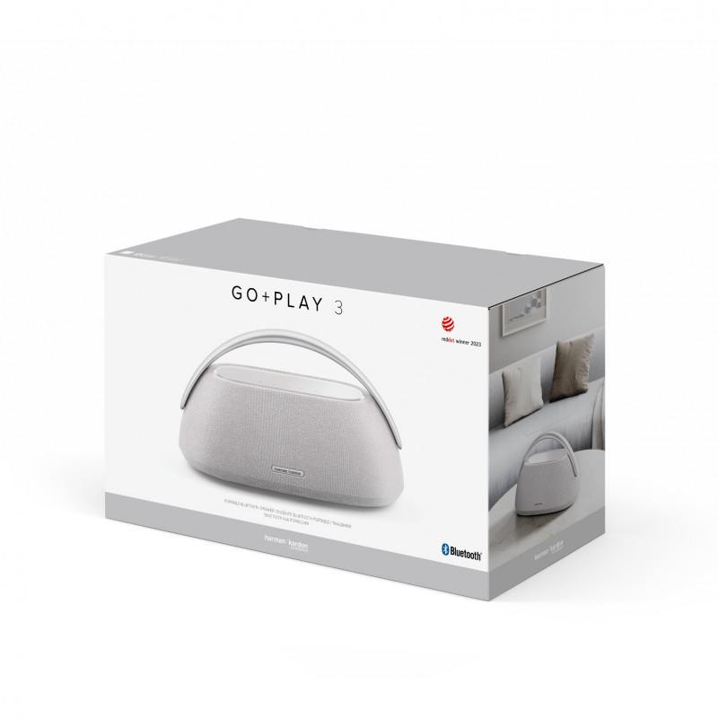 "Harman/Kardon Go + Play 3. Speaker type: 3-way, Tweeter diameter: 2 cm, Subwoofer driver diameter: 13 cm. RMS rated power: 160 W, Frequency range: 43 - 20000 Hz, Signal-to-Noise Ratio (SNR): 80 dB. Connectivity technology: Wireless, Frequency range: 2400 - 2483 GHz, Bluetooth profiles: A2DP, AVRCP. Product type: Stereo portable speaker, Product colour: Grey, Silver. Recommended usage: Universal, Audio formats supported: MP3"\n"SUPERIOR SOUND PERFORMANCE WITH THREE-WAY SPEAKERS