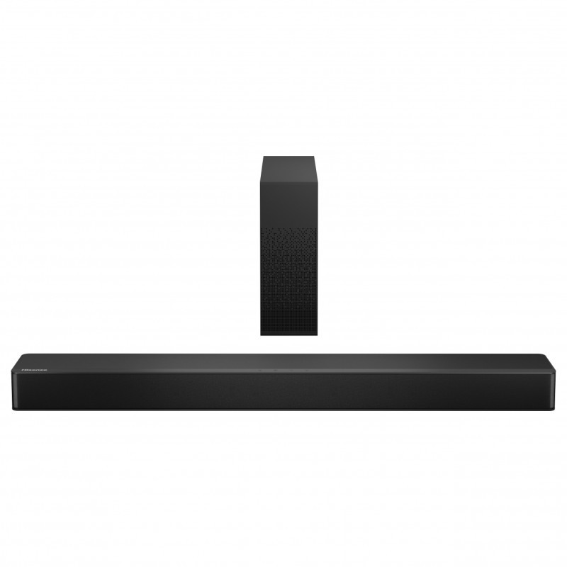 "Hisense - HS2100 ČR. Audio output channels: 2.1 channels, RMS rated power: 240 W, Audio decoders: DTS Virtual:X, Dolby Digital, Dolby Digital Plus. Soundbar speaker RMS power: 120 W, Crossover frequency: 20000 Hz, Woofer diameter (imperial): 13.3 cm (5.25""). Subwoofer type: Active subwoofer, Subwoofer connectivity: Wireless, Subwoofer RMS power: 120 W. Product colour: Black, Audio formats supported: MP3, WAV, WMA, Volume control: Buttons. Connectivity technology: Wired & Wireless"\n"Powerful Audio, Sleek Design