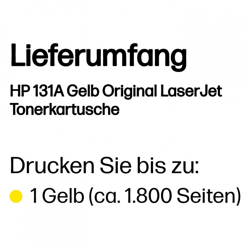 "HP 131A Yellow Original LaserJet Toner Cartridge. Colour toner page yield: 1800 pages, Printing colours: Yellow, Quantity per pack: 1 pc(s)"\n"Ideal for printing professional-quality documents and marketing materials in the office, with consistent, high-quality results.