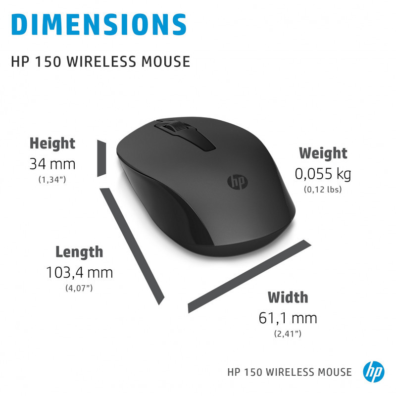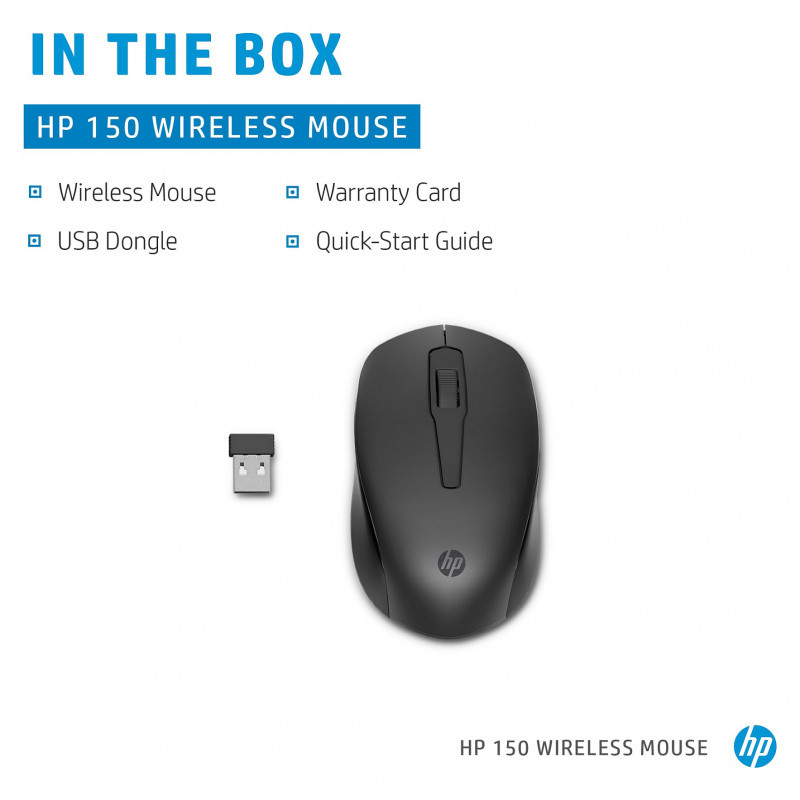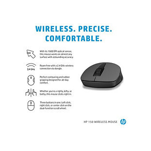 "HP 150 Wireless Mouse. Form factor: Ambidextrous. Movement detection technology: Optical, Device interface: RF Wireless, Movement resolution: 1600 DPI, Buttons quantity: 3, Scroll type: Wheel. Power source: Batteries. Product colour: Black"\n"Wireless. Precise. Comfortable.