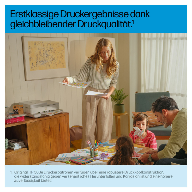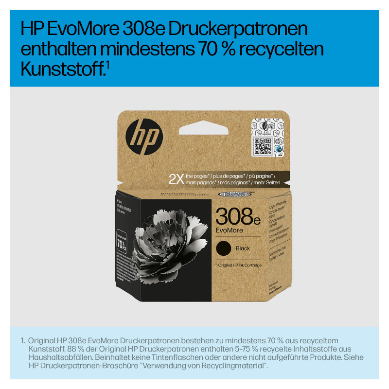 "HP 308e EvoMore Black Original Ink Cartridge. Black ink type: Pigment-based ink, Cartridge capacity: Standard Yield, Supply type: Single pack, Printing colours: Black, Quantity per pack: 1 pc(s), Black ink page yield: 320 pages"\n
