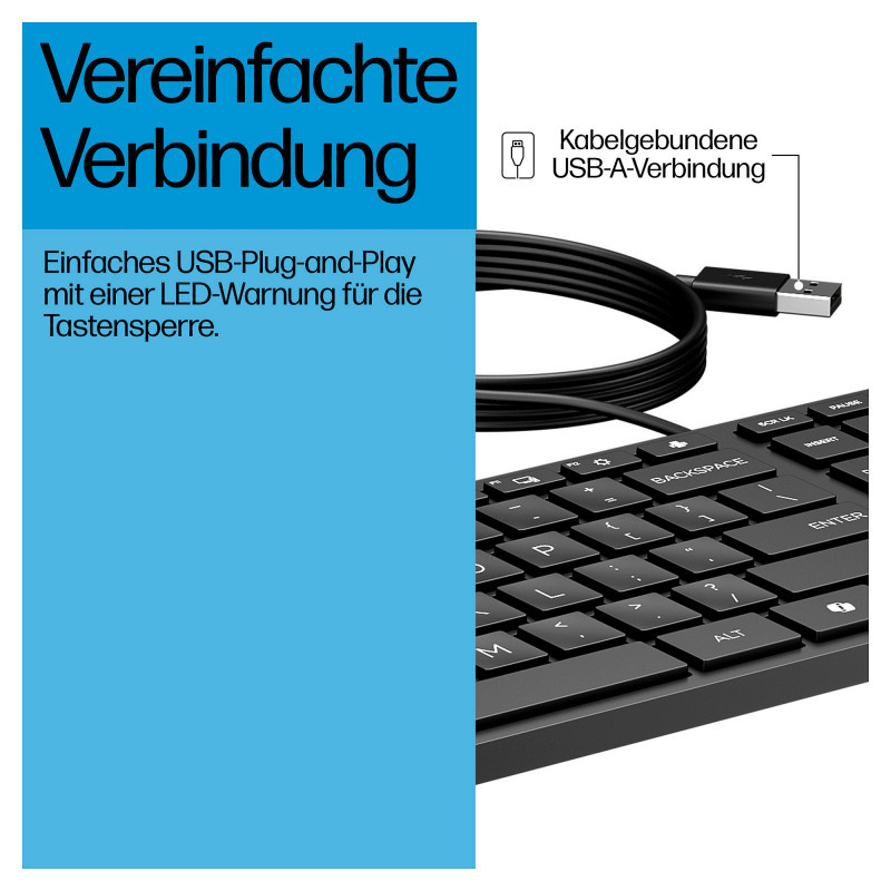 "HP Wired Desktop 320K Keyboard. Keyboard form factor: Full-size (100%), Connectivity technology: Wired, Device interface: USB, Keyboard key switch: Membrane. Cable length: 1.8 m. Recommended usage: Office. Product colour: Black"\n"Every Day Productivity