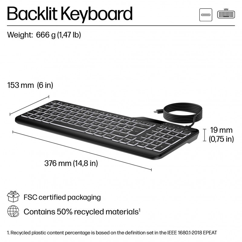 "HP 400 Backlit Wired Keyboard. Keyboard form factor: Full-size (100%), Connectivity technology: Wired, Device interface: USB, Recommended usage: Home. Product colour: Black"\n"The 24/7 keyboard
