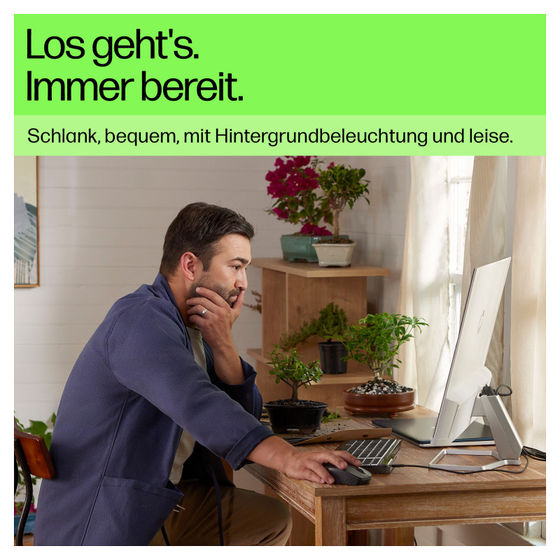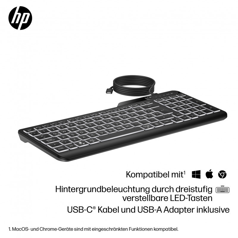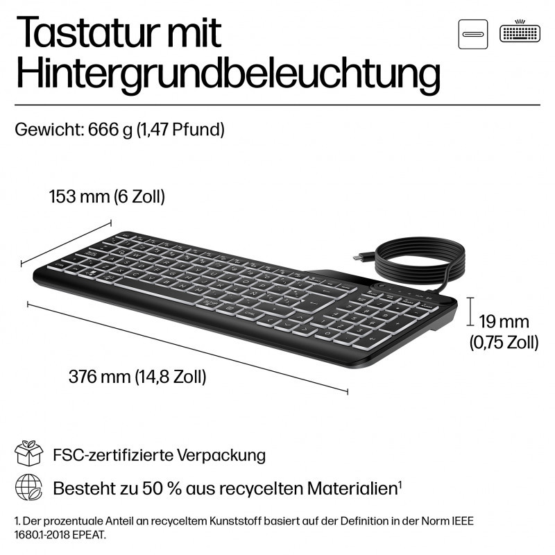 "HP 405 Multi-Device Backlit Wired Keyboard. Keyboard form factor: Full-size (100%), Connectivity technology: Wired, Device interface: USB, Keyboard key switch: Membrane, Recommended usage: Office. Product colour: Black"\n"The 24/7 keyboard