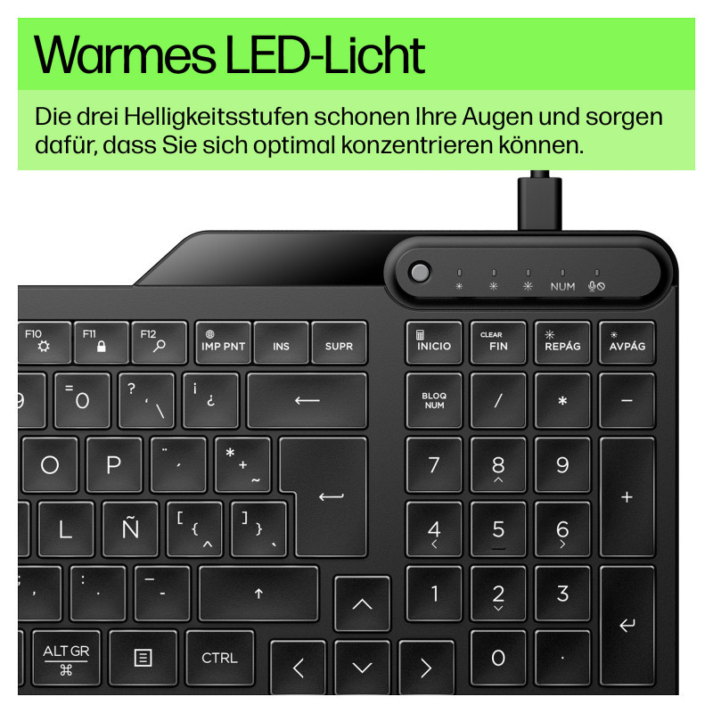With warm white illuminated keys, this ready-to-go keyboard never misses a beat. Plug into your device and grind away with quiet keys and three levels of backlit LED glow. Plus, skyrocket your productivity with 12 programmable keys. Work and play all day on the slim and sanitizable[1] HP 405 Backlit Wired Keyboard."