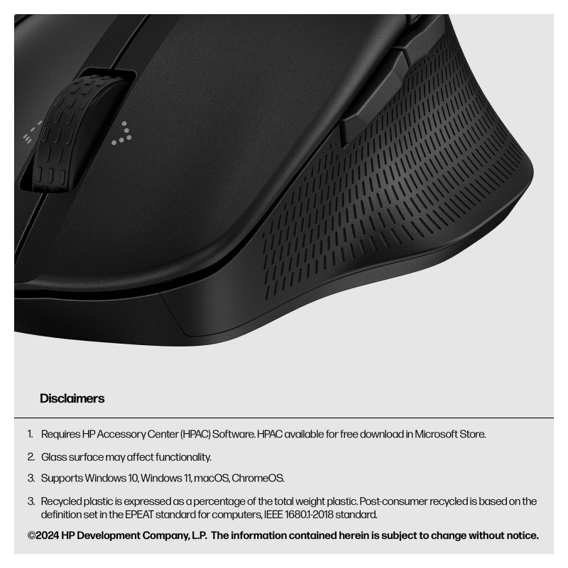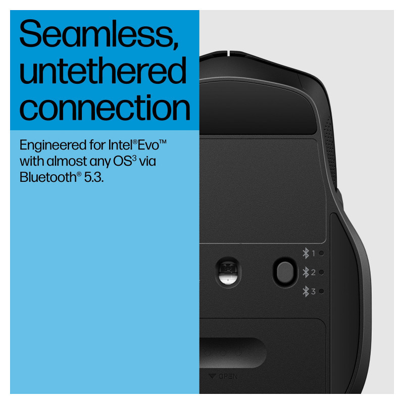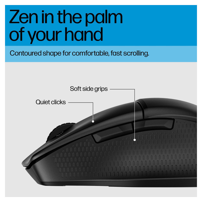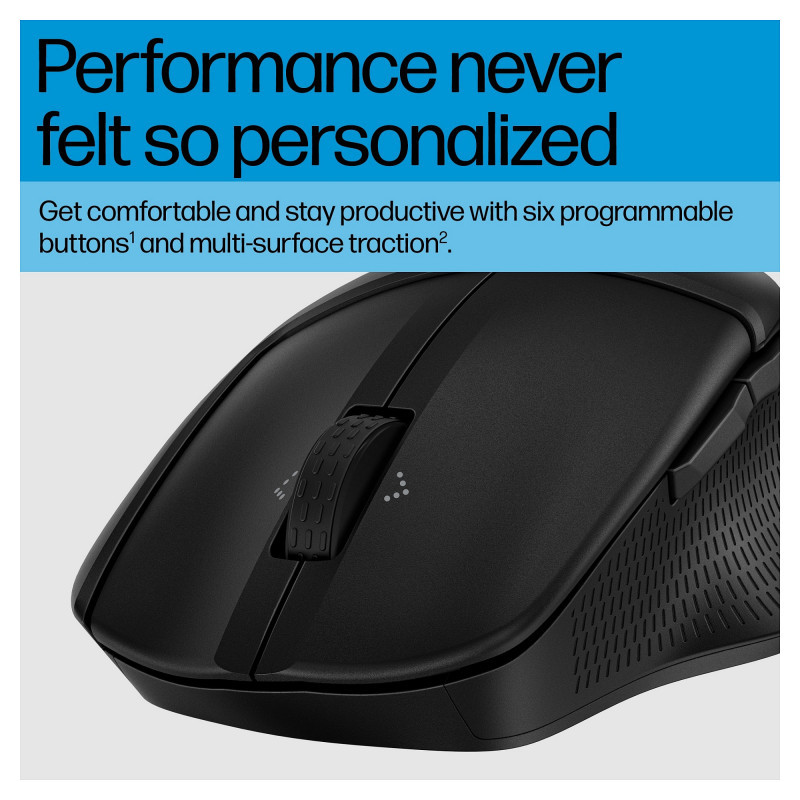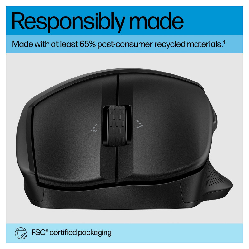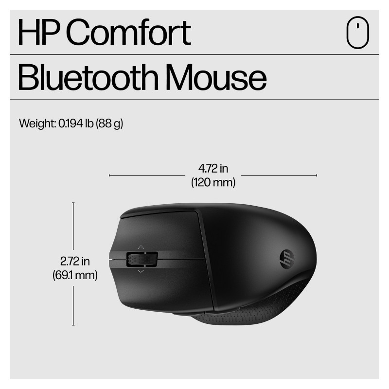 "HP 480 Comfort Bluetooth Mouse. Form factor: Right-hand. Device interface: Bluetooth, Movement resolution: 4000 DPI, Buttons type: Pressed buttons, Buttons quantity: 7, Scroll type: Wheel. Power source: Batteries. Works on any surface. Product colour: Black"\n"A mouse built around you