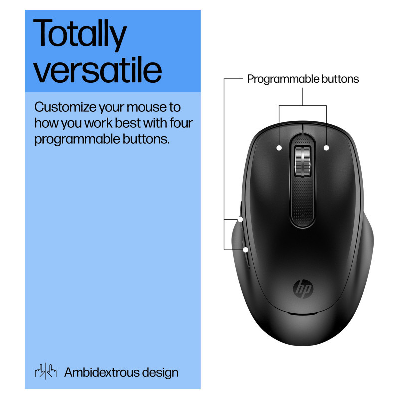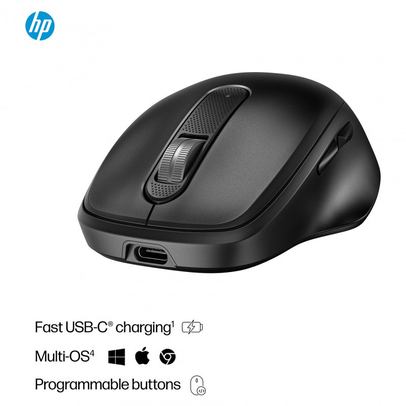 "HP 515 Ultra-Fast Rechargeable Wireless Mouse. Form factor: Ambidextrous. Device interface: RF Wireless, Movement resolution: 4000 DPI, Buttons quantity: 5, Scroll type: Wheel. Power source: Batteries. Product colour: Black"\n"Fast Charge Your Productivity