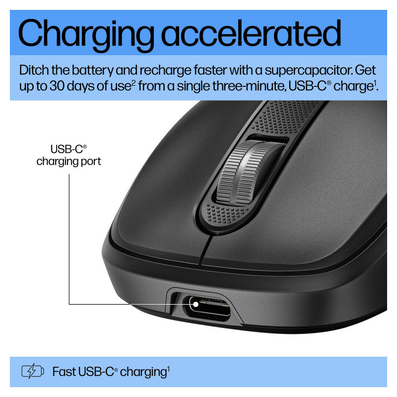 Recharge the way you work with the HP 515 Ultra-Fast Rechargeable Wireless Mouse. Charge in 3 minutes and track on almost any surface[2], with accurate control and across multiple operating systems, to maintain productivity wherever work takes you."