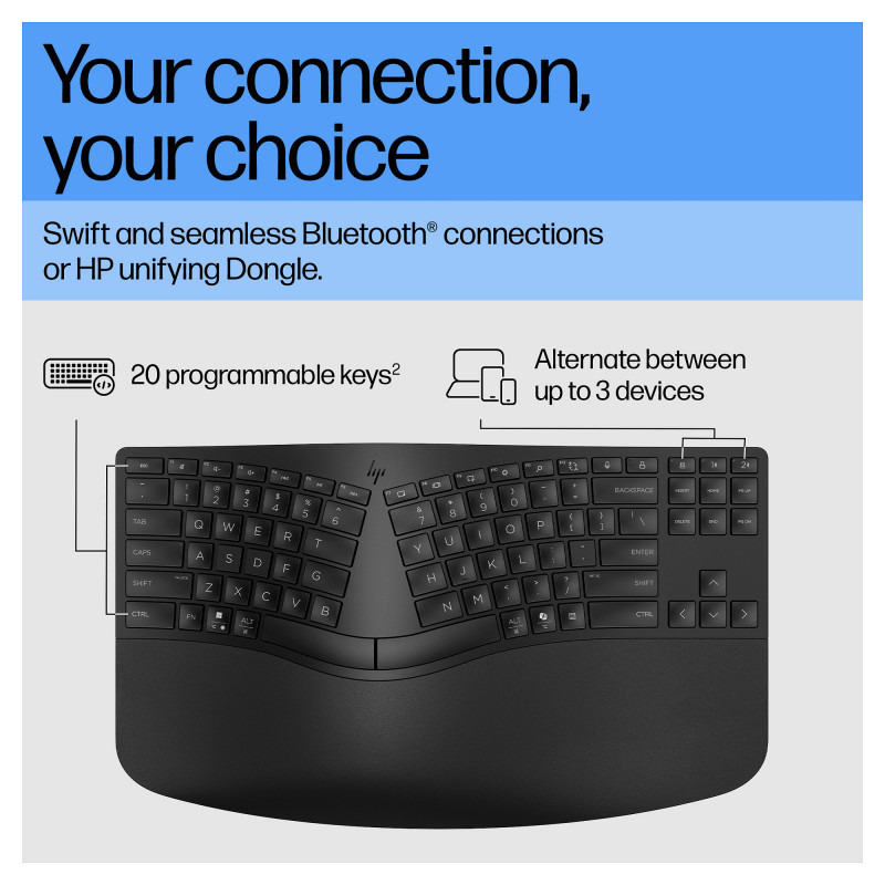 Build a space that works for you with the scientifically-designed HP Ergonomic Wireless Keyboard. The split-zone layout adapts to you, while twenty programmable keys[1] and a separate numeric keypad offer total customization. And with two ways to connect devices, you can work assured you've got the right tools for the task."