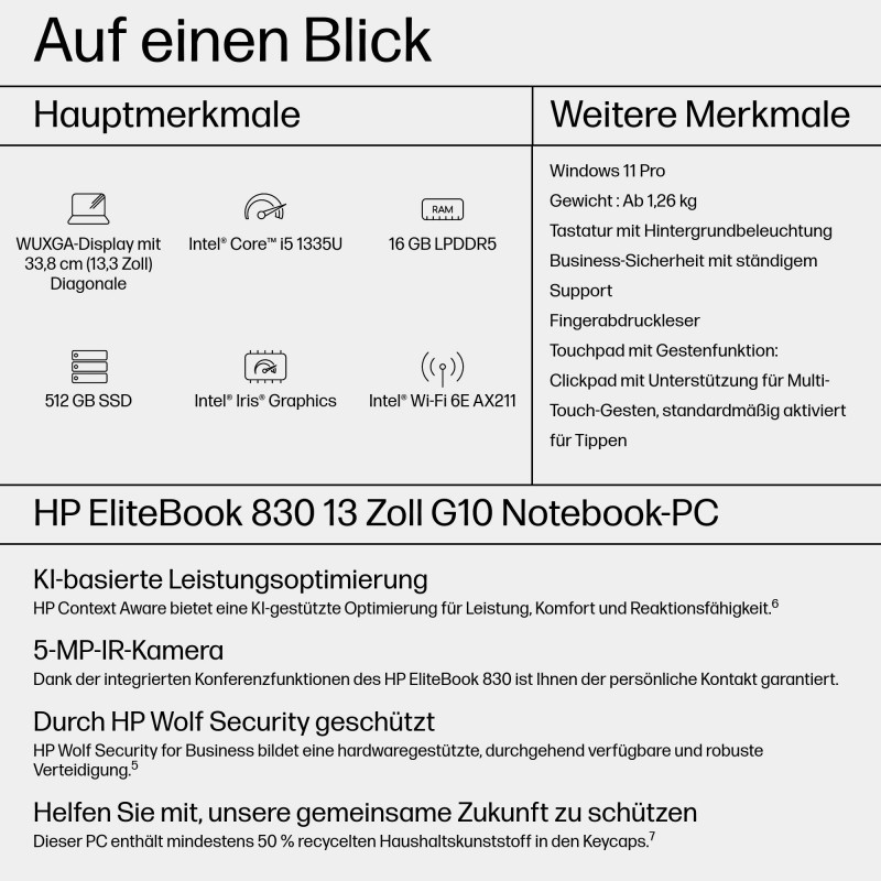 "HP EliteBook 830 13 G10. Product type: Laptop, Form factor: Clamshell. Processor family: Intel® Core™ i5, Processor model: i5-1335U, Processor frequency: 1.3 GHz. Display diagonal: 33.8 cm (13.3""), HD type: WUXGA, Display resolution: 1920 x 1200 pixels. Internal memory: 16 GB, Internal memory type: LPDDR5-SDRAM. Total storage capacity: 512 GB, Storage media: SSD. Mobile network generation: 4G. Operating system installed: Windows 11 Pro. Product colour: Silver"\n"The right PC for hybrid work