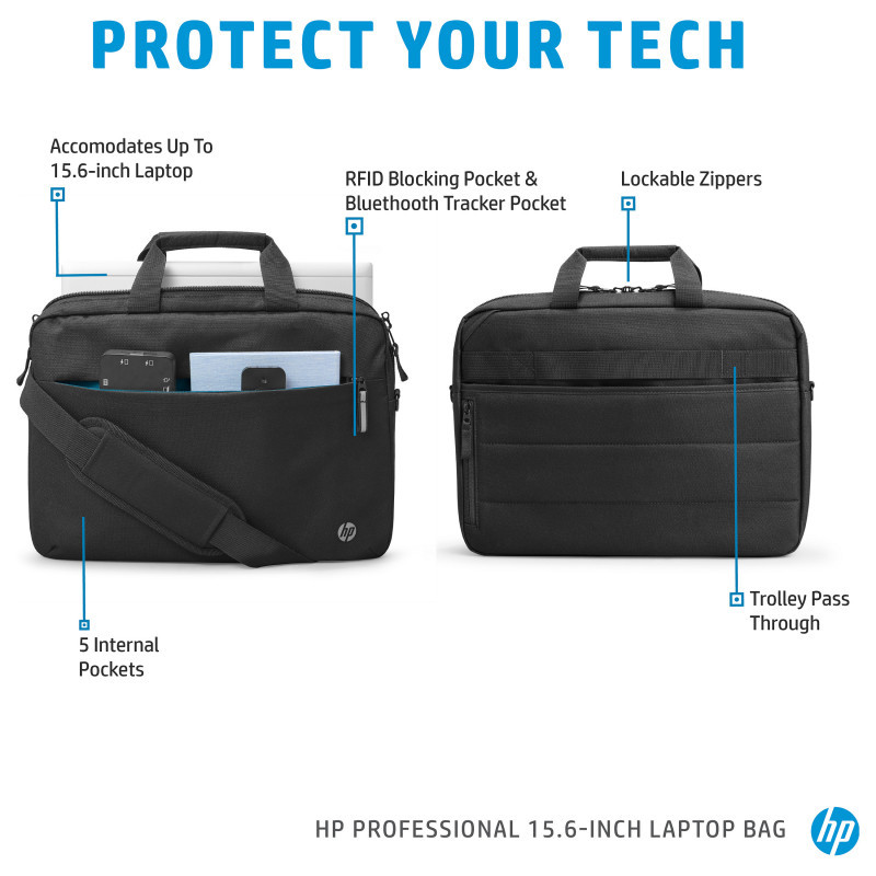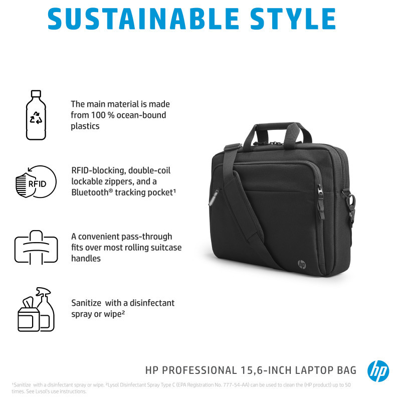 "HP Professional 15.6-inch Laptop Bag. Case type: Briefcase, Maximum screen size: 39.6 cm (15.6""). Weight: 610 g. Surface coloration: Monochromatic"\n"Designed With You and the Environment In Mind