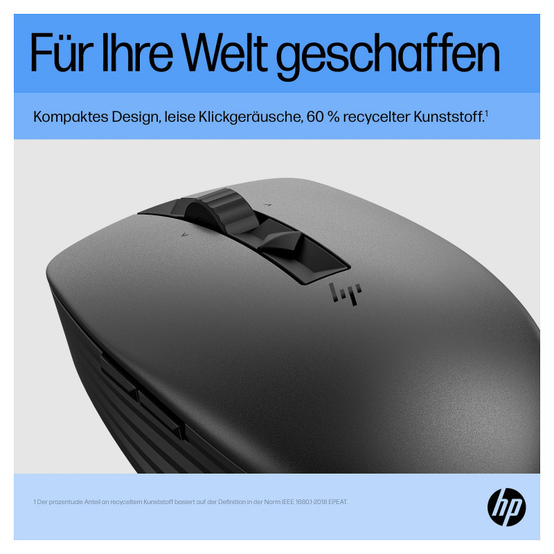 "HP 710 Rechargeable Silent Mouse. Form factor: Ambidextrous. Device interface: RF Wireless + Bluetooth, Movement resolution: 3000 DPI, Buttons quantity: 7, Scroll type: Wheel. Power source: Batteries. Product colour: Black"\n"Can a Mouse Set You Free?