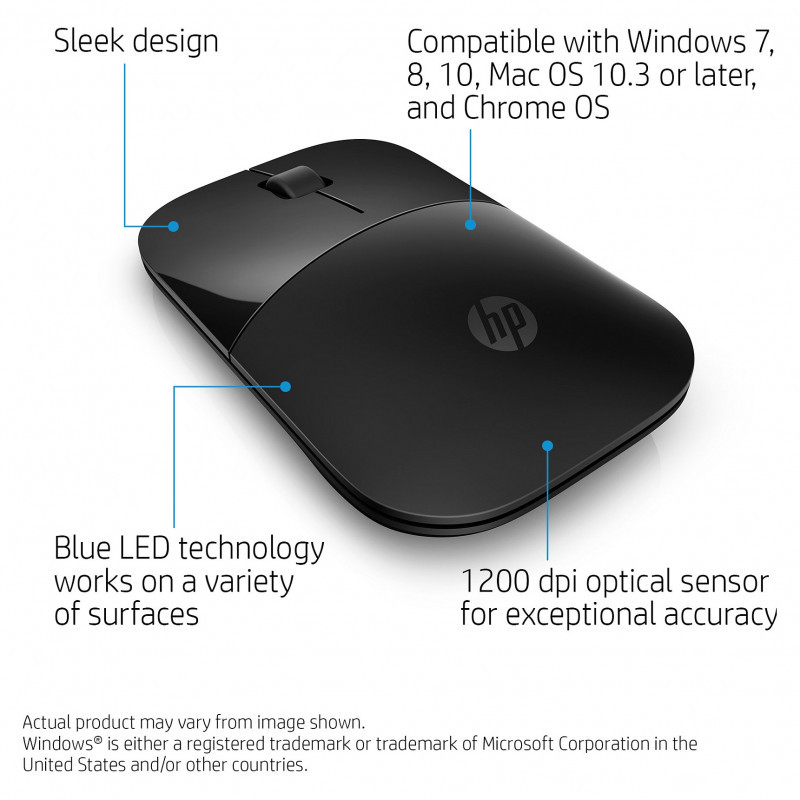 "HP Z3700 Black Wireless Mouse. Form factor: Ambidextrous. Movement detection technology: Optical, Device interface: RF Wireless, Movement resolution: 1200 DPI, Buttons type: Pressed buttons, Buttons quantity: 3, Scroll type: Wheel. Power source: Batteries. Product colour: Black"\n"The mouse that makes a statement