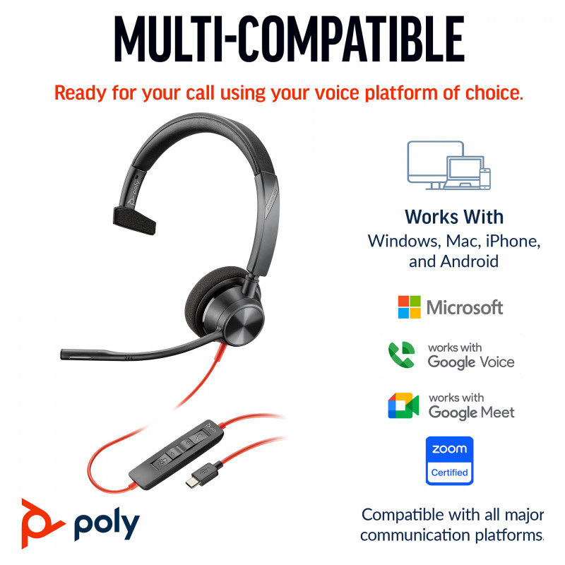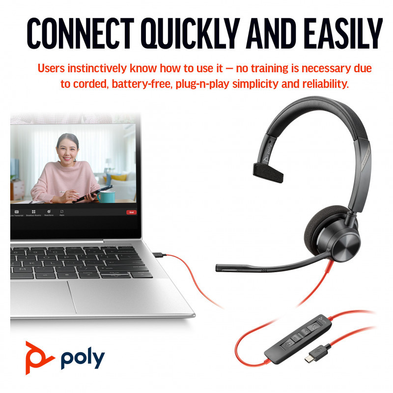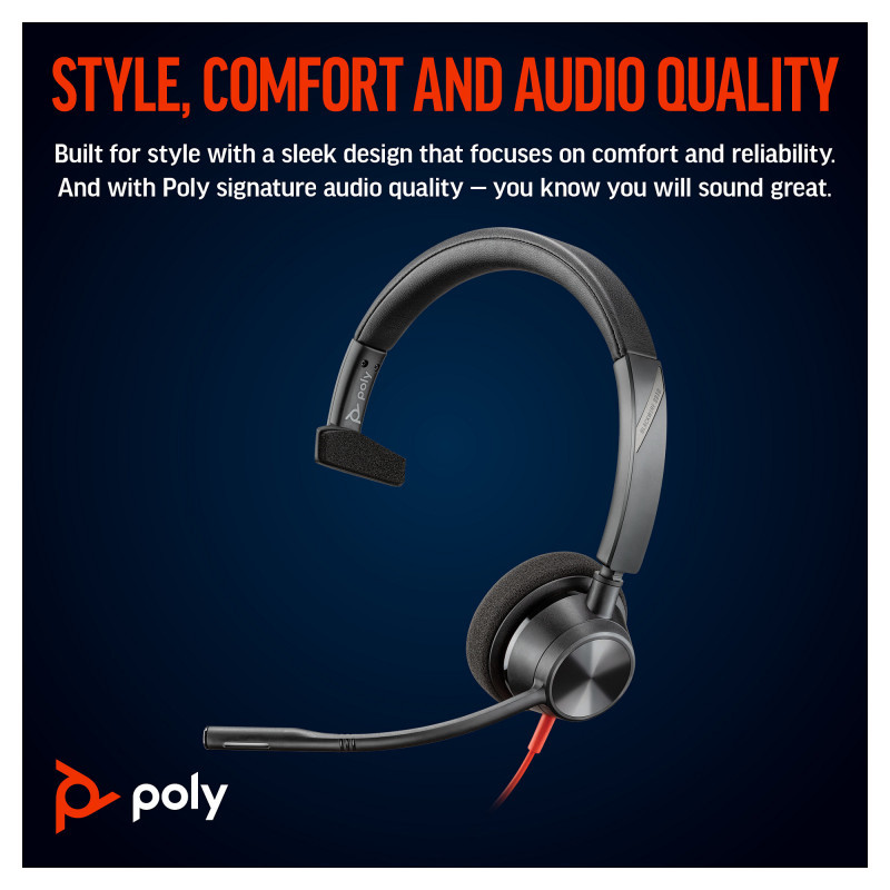 "HP Poly Blackwire 3310 Monaural Microsoft Teams Certified USB-C Headset +USB-C/A Adapter. Product type: Headset. Connectivity technology: Wired. Recommended usage: Business/Everyday. Weight: 103 g. Product colour: Black"\n"Style, comfort and audio quality