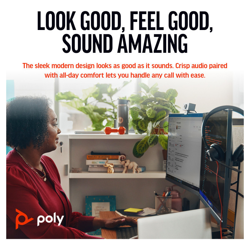 Built for style with a sleek design that focuses on comfort and reliability. Poly signature audio quality so you know you will sound great. And intuitive and simple features so every user can connect to their preferred device simply and easily."