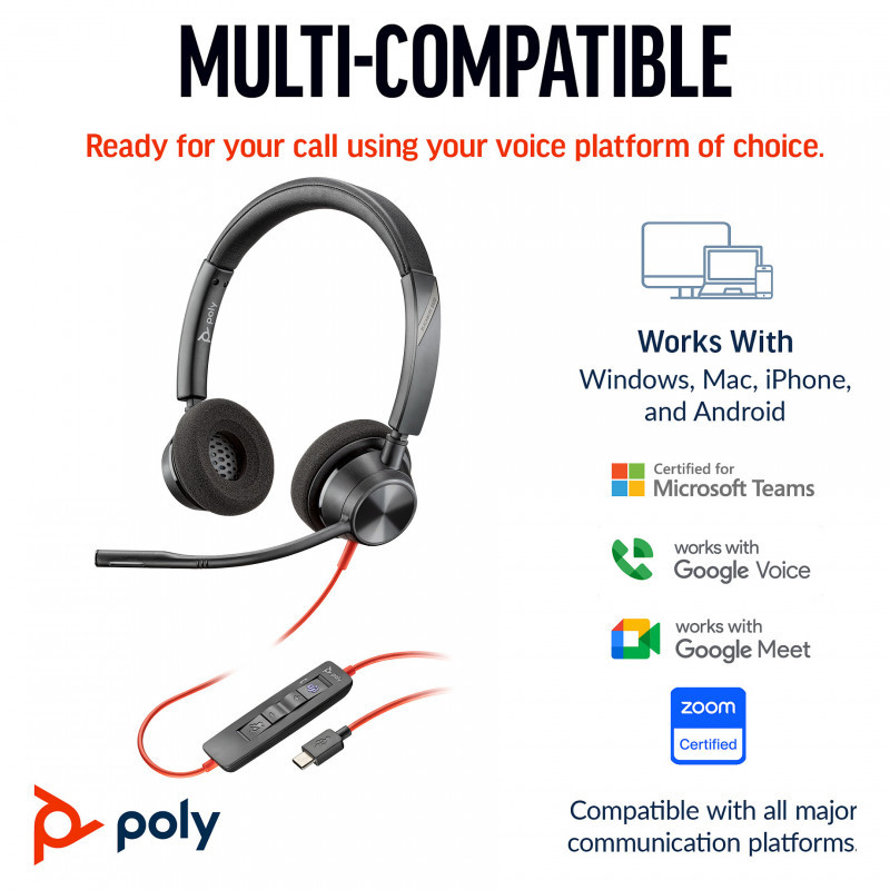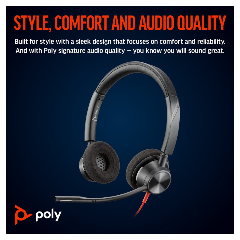 "HP Poly Blackwire 3320 Stereo Microsoft Teams Certified USB-C Headset +USB-C/A Adapter. Product type: Headset. Connectivity technology: Wired. Headphone frequency: 20 - 20000 Hz. Weight: 131 g. Product colour: Black"\n"Style, comfort and audio quality