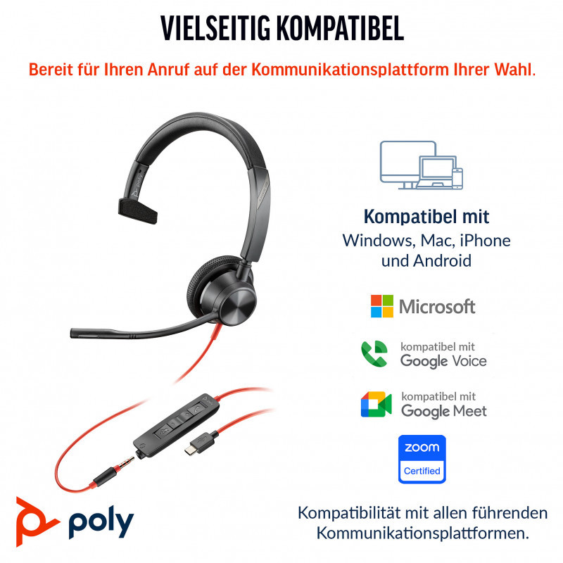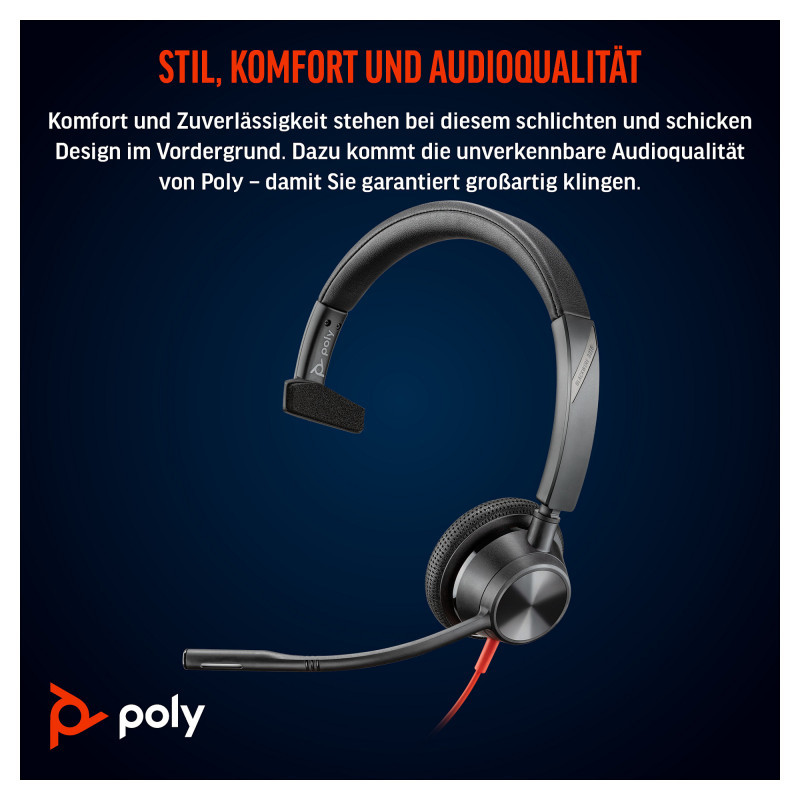 "HP Poly Blackwire 3315 Monaural USB-C Headset +3.5mm Plug +USB-C/A Adapter. Product type: Headset. Connectivity technology: Wired. Recommended usage: Office/Call center. Weight: 103 g. Product colour: Black"\n"Style, comfort and audio quality