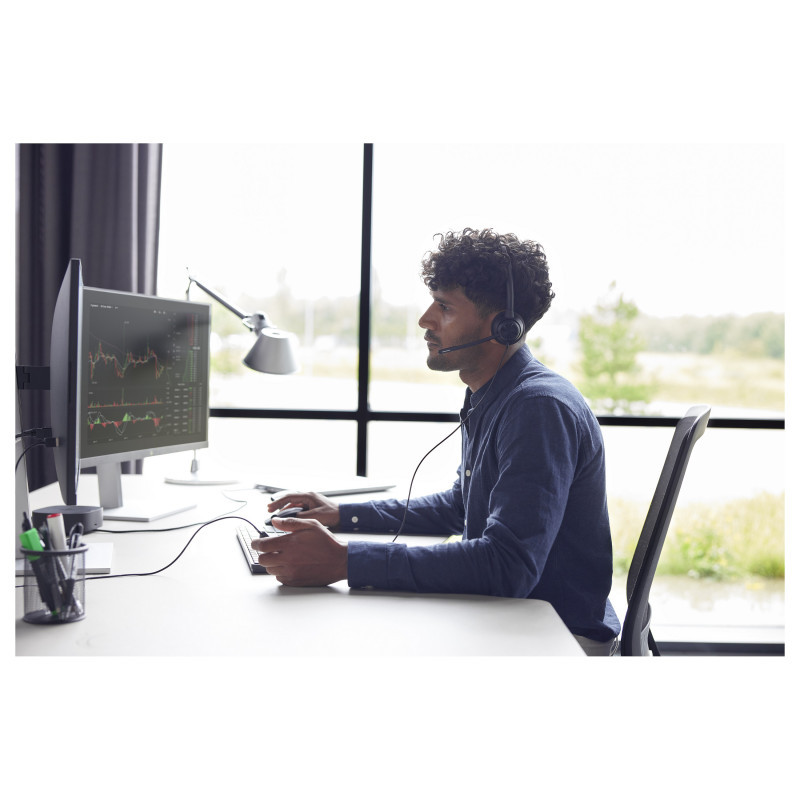 "HP Poly EncorePro 320 Stereo USB-A Headset TAA. Product type: Headset. Connectivity technology: Wired. Recommended usage: Office/Call center, Cable length: 2.19 m. Weight: 105 g. Product colour: Black"\n"Comfort. Reliability. Value.