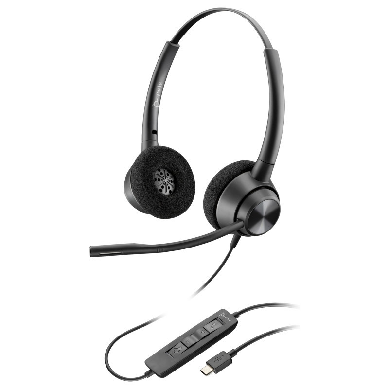 "HP Poly EncorePro 320 Stereo USB-C Headset TAA. Product type: Headset. Connectivity technology: Wired. Recommended usage: Calls/Music, Cable length: 2.19 m. Weight: 70 g. Product colour: Black"\n"Comfort. Reliability. Value.