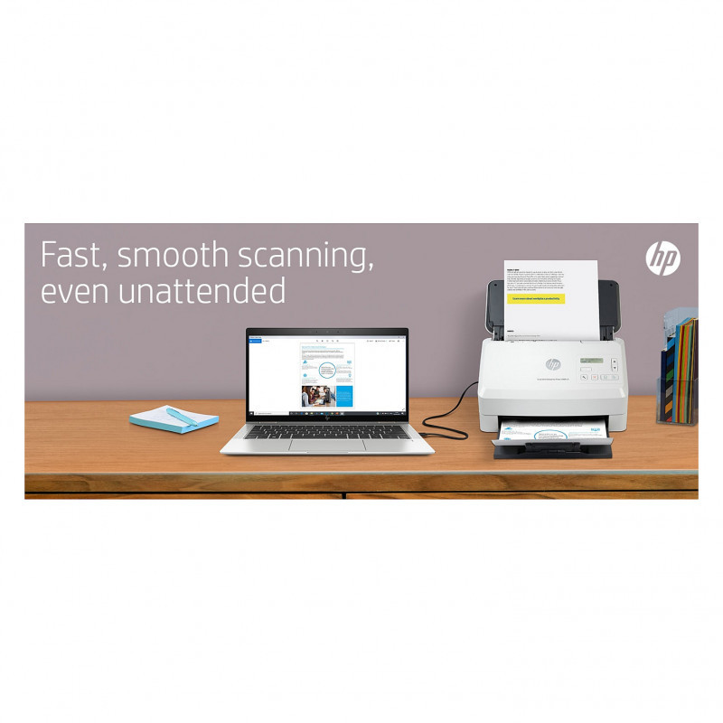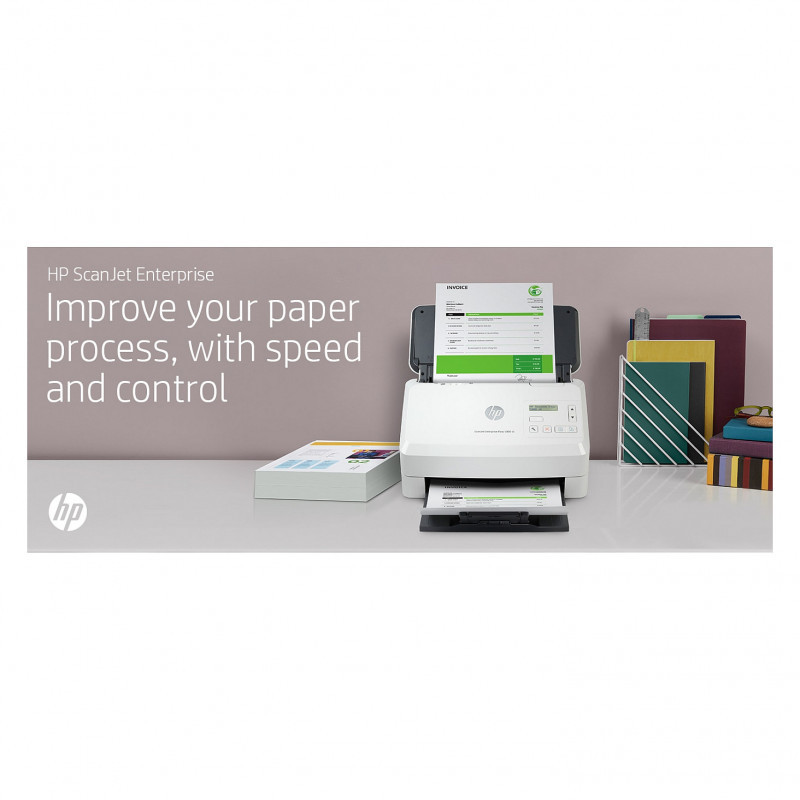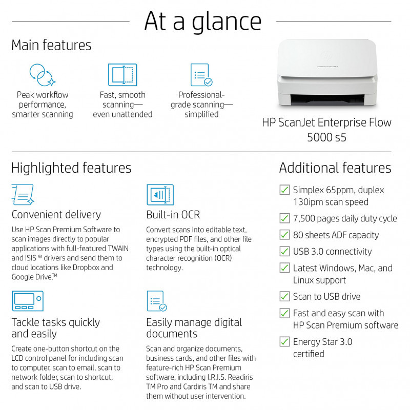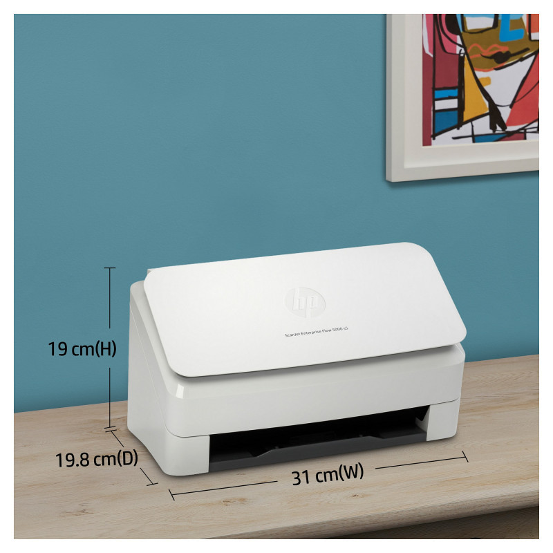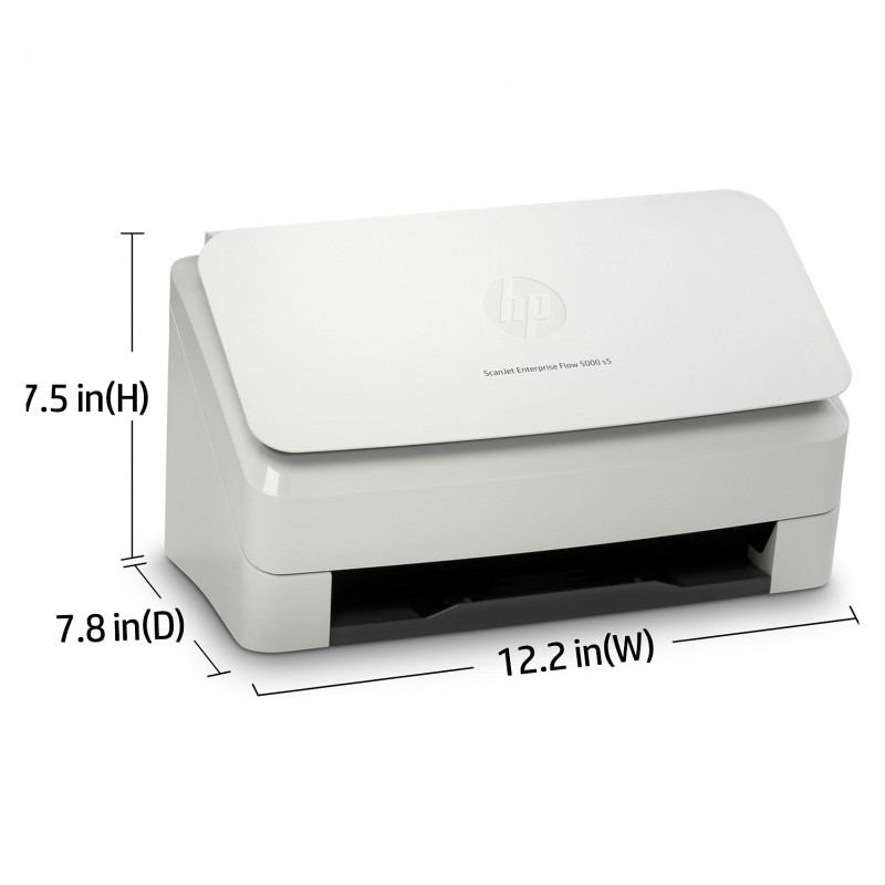 "HP Scanjet Enterprise Flow 5000 s5. Maximum scan size: 216 x 3100 mm, Optical scanning resolution: 600 x 600 DPI. Scanner type: Sheet-fed scanner, Product colour: White. Sensor type: CMOS CIS, Daily duty cycle (max): 7500 pages, Scanning noise level: 65 dB. Auto document feeder (ADF) input capacity: 80 sheets. Maximum ISO A-series paper size: A4"\n"Give your office high-volume scanning performance. Recommended for 7,500 pages per day.