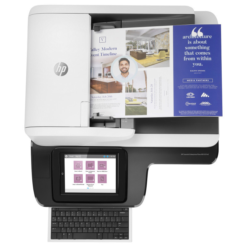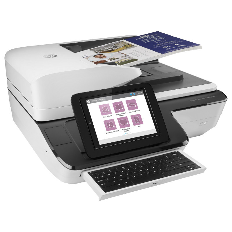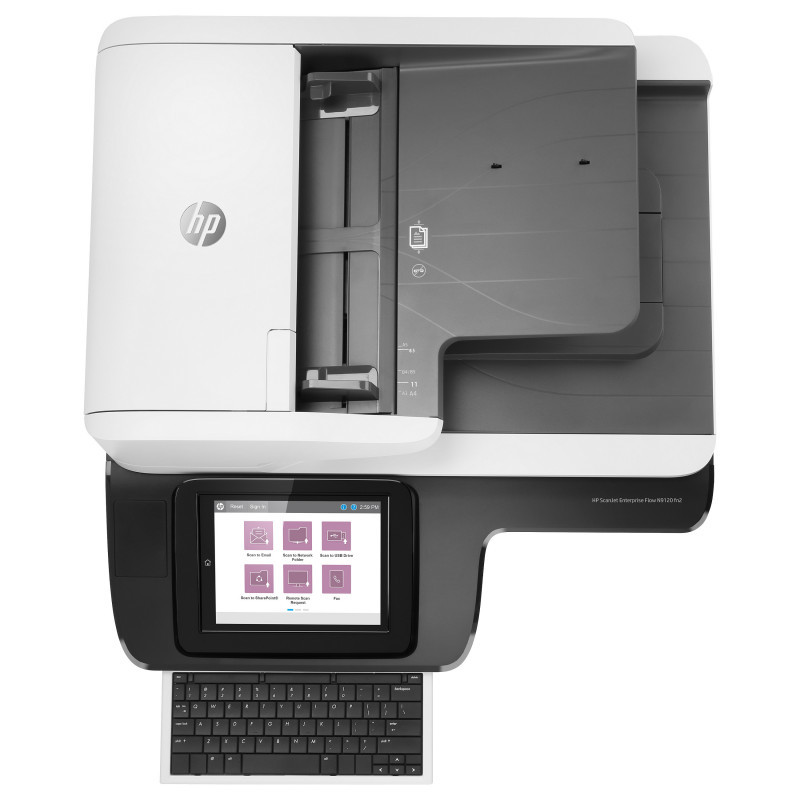 "HP Scanjet Enterprise Flow N9120 fn2. Maximum scan size: 297 x 432 mm, Optical scanning resolution: 600 x 600 DPI, ADF scan speed (b/w, A4): 120 ppm. Scanner type: Flatbed & ADF scanner, Product colour: Black, White, Display: LCD. Sensor type: CIS, Daily duty cycle (max): 20000 pages, Scan file formats: CSV, HTML, JPG, OCR, PDF, RTF, TIFF, TXT, XPS. Maximum ISO A-series paper size: A3, Scanning media types supported: Card stock, Envelopes, Labels, Photo paper, Plain paper, ISO A-series sizes (A0...A9): A3, A4, A5, A6. Standard interfaces: RJ-45, USB"\n"Fast, smooth scanning – even unattended