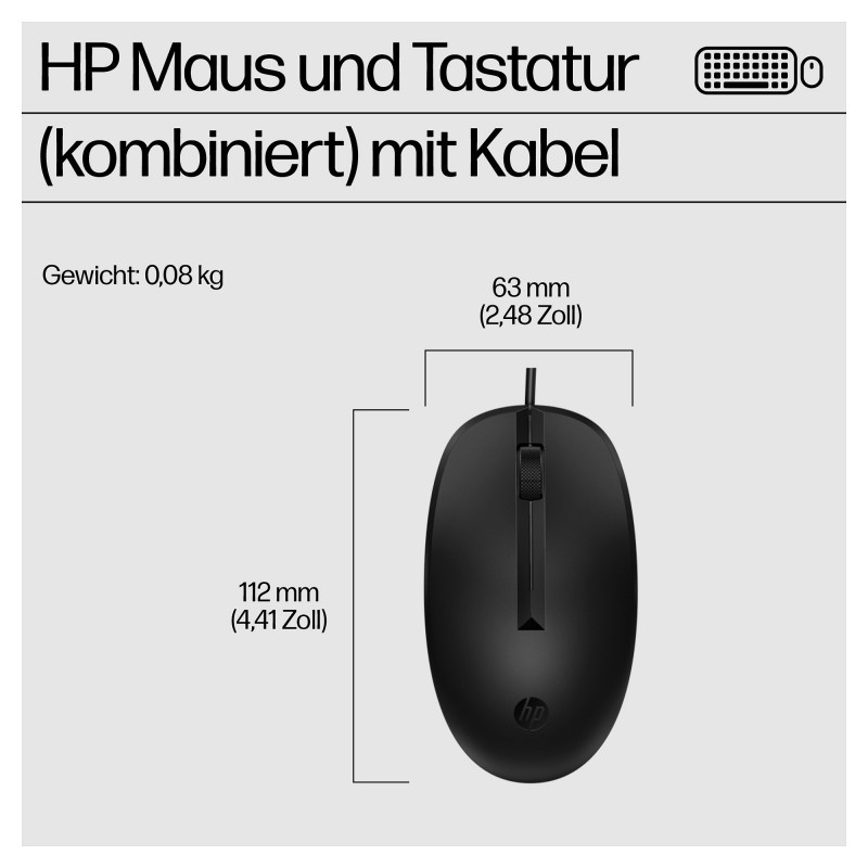 "HP 225 Wired Mouse and Keyboard Combo. Keyboard form factor: Full-size (100%), Connectivity technology: Wired, Device interface: USB. Cable length: 1.8 m. Recommended usage: Office. Product colour: Black. Mouse included"\n"Every Day Productivity