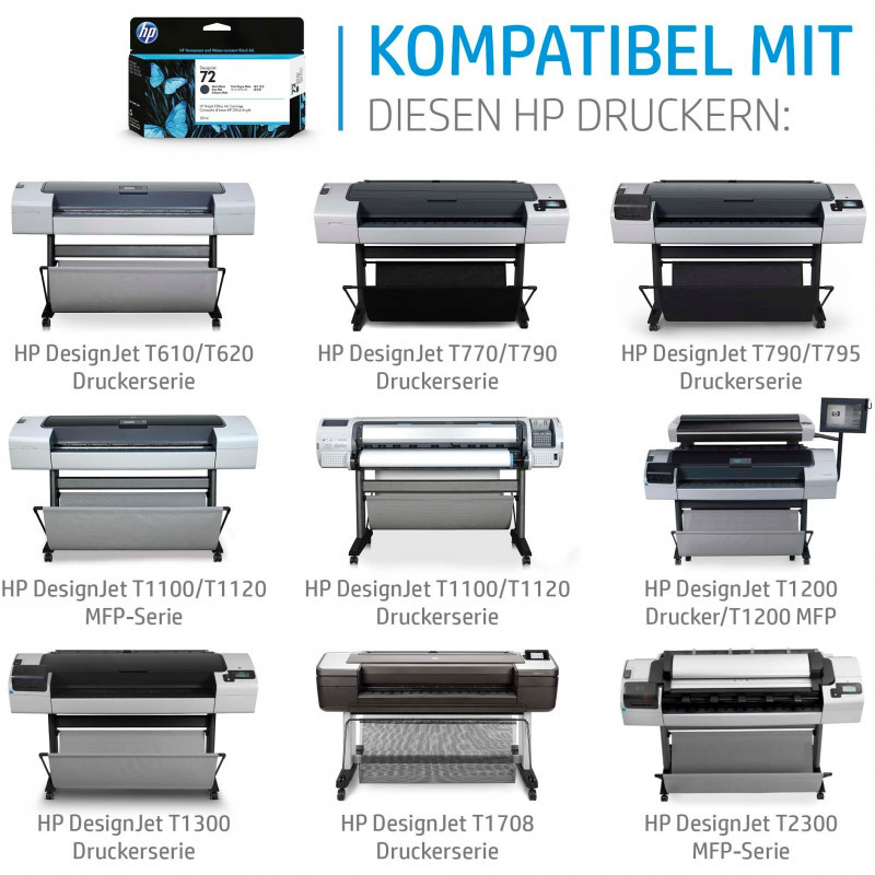 "HP 72 130-ml Matte Black DesignJet Ink Cartridge. Compatibility: HP DesignJet T610 Printer series, T620 Printer series, T770 Printer series, T1100 Printer series,..., Print technology: Thermal inkjet, Printing colours: Black. Width: 202 mm, Depth: 40 mm, Height: 129 mm. Package width: 202 mm, Package depth: 40 mm, Package height: 129 mm. Master (outer) cases per pallet: 84 pc(s), Products per pallet: 1680 pc(s), Layers per pallet: 6 pc(s). Pallet dimensions (W x D x H): 1219 x 1016 x 1500 mm, Pallet size (EU): 1219 x 1016 x 1500 mm"\n"Ideal for professionals and workteams who print technical applications.