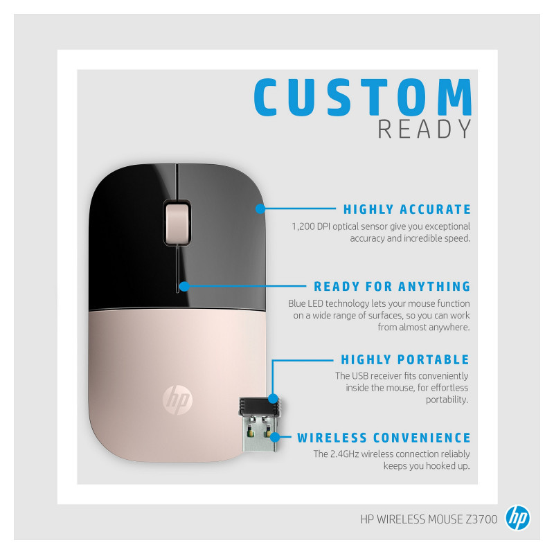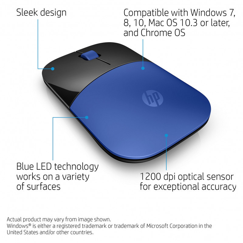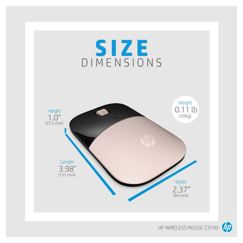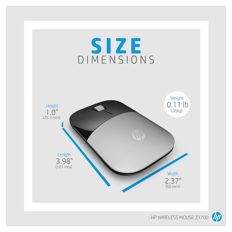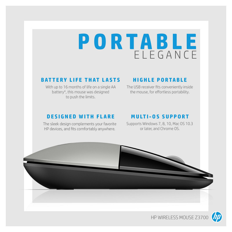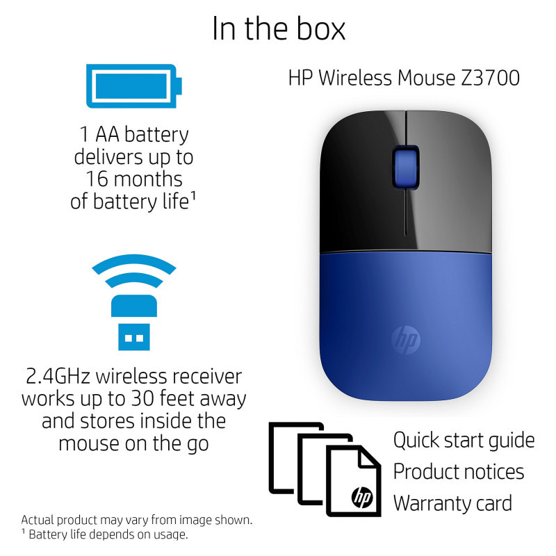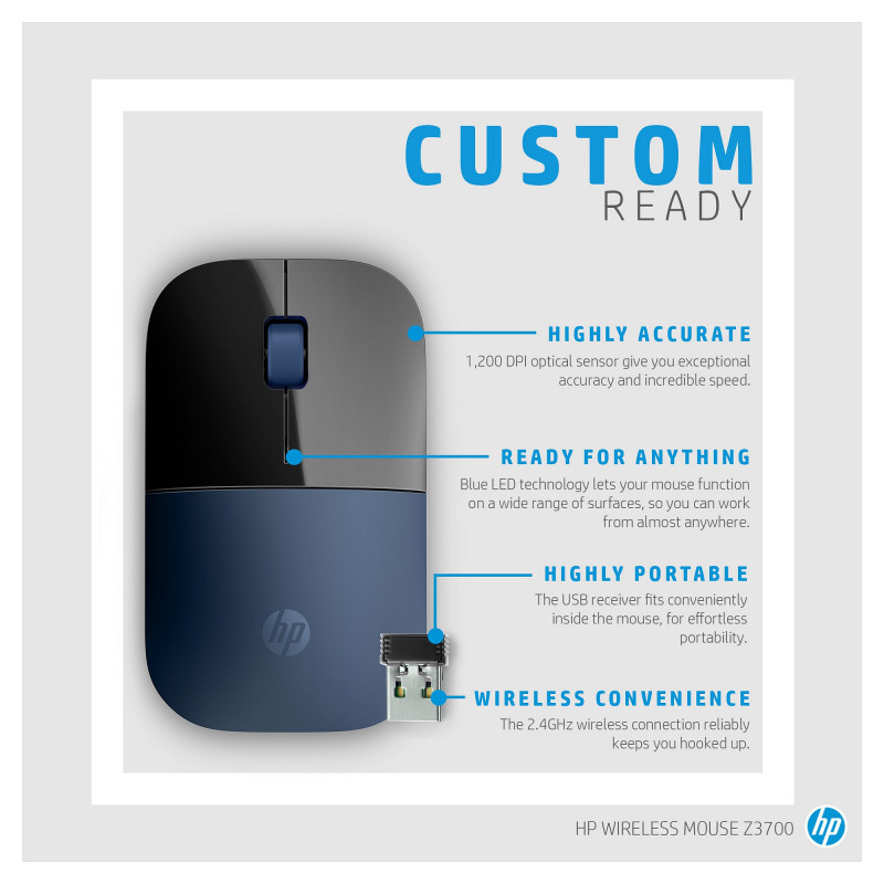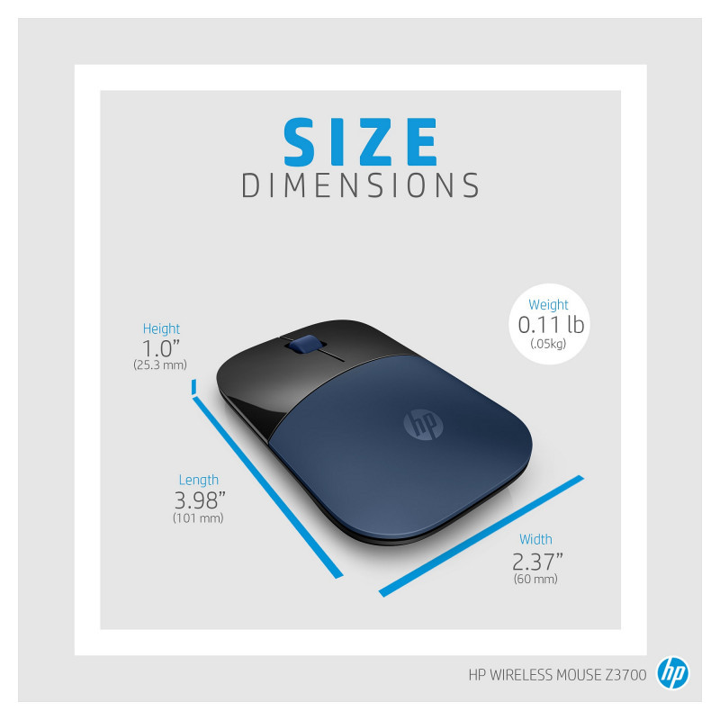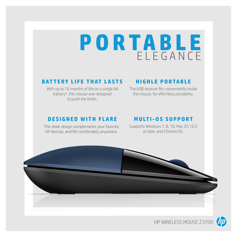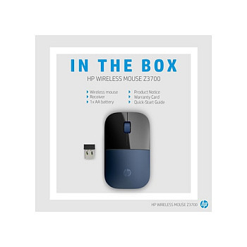 "HP Z3700 Blue Wireless Mouse. Form factor: Ambidextrous. Movement detection technology: Optical, Device interface: RF Wireless, Movement resolution: 1200 DPI, Buttons type: Pressed buttons, Buttons quantity: 3, Scroll type: Wheel. Power source: Batteries. Product colour: Blue"\n"The mouse that makes a statement