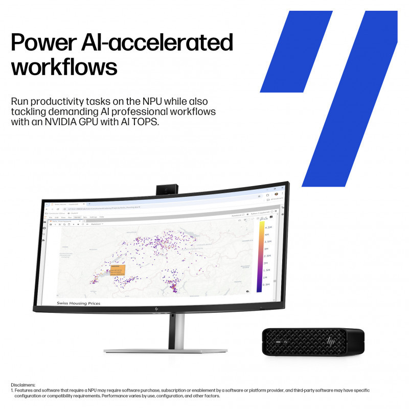 "HP Z2 G1i. Processor family: Intel Core Ultra 7, Processor model: 265. Internal memory: 32 GB, Internal memory type: DDR5-SDRAM, Memory clock speed: 6400 MHz. Total storage capacity: 1 TB, Storage media: SSD. On-board graphics card model: Intel Graphics, Discrete graphics card model: NVIDIA RTX A400. Wi-Fi. Operating system installed: Windows 11 Pro. Power supply: 280 W. Chassis type: Mini PC. Product type: Workstation. Product colour: Black"\n"Powers large workflows. Fits a tiny space.
