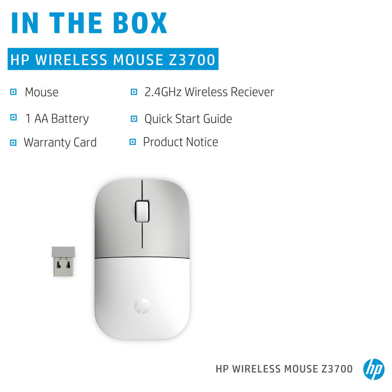 "HP Z3700 Ceramic White Wireless Mouse. Form factor: Ambidextrous. Movement detection technology: Optical, Device interface: RF Wireless, Movement resolution: 1200 DPI, Buttons type: Pressed buttons, Buttons quantity: 2, Scroll type: Wheel. Power source: Batteries. Product colour: Silver, White"\n"The mouse that makes a statement