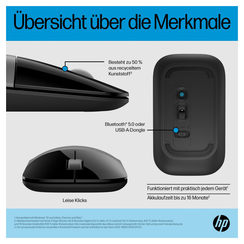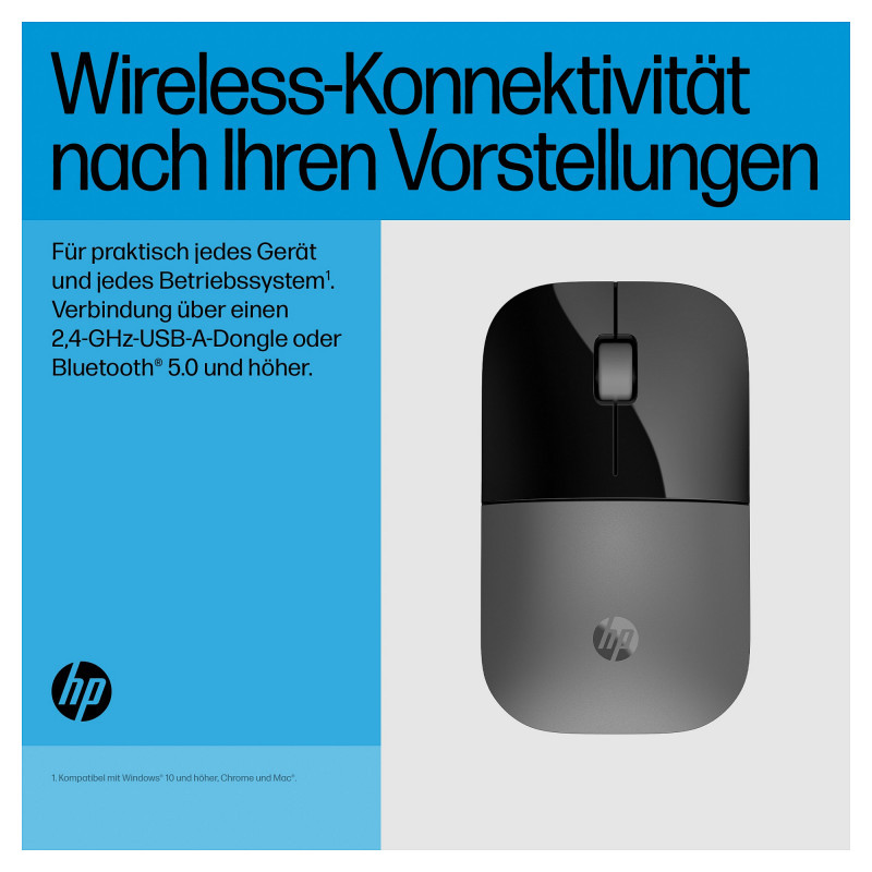 "HP Z3700 Dual Silver Mouse. Form factor: Ambidextrous. Device interface: RF Wireless + Bluetooth, Buttons quantity: 3, Scroll type: Wheel. Power source: Batteries. Product colour: Silver"\n"Ready for Anything Anywhere