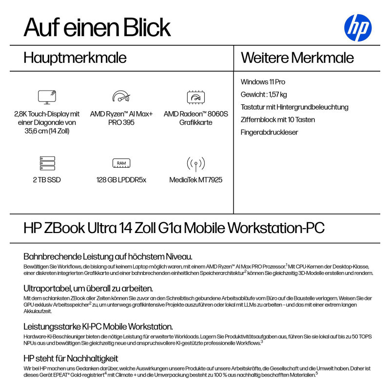 HP ZBook Ultra 14 G1a AMD Ryzen AI Max+ PRO 395 14Zoll WUXGA 128GB 2TB/SSD W11P