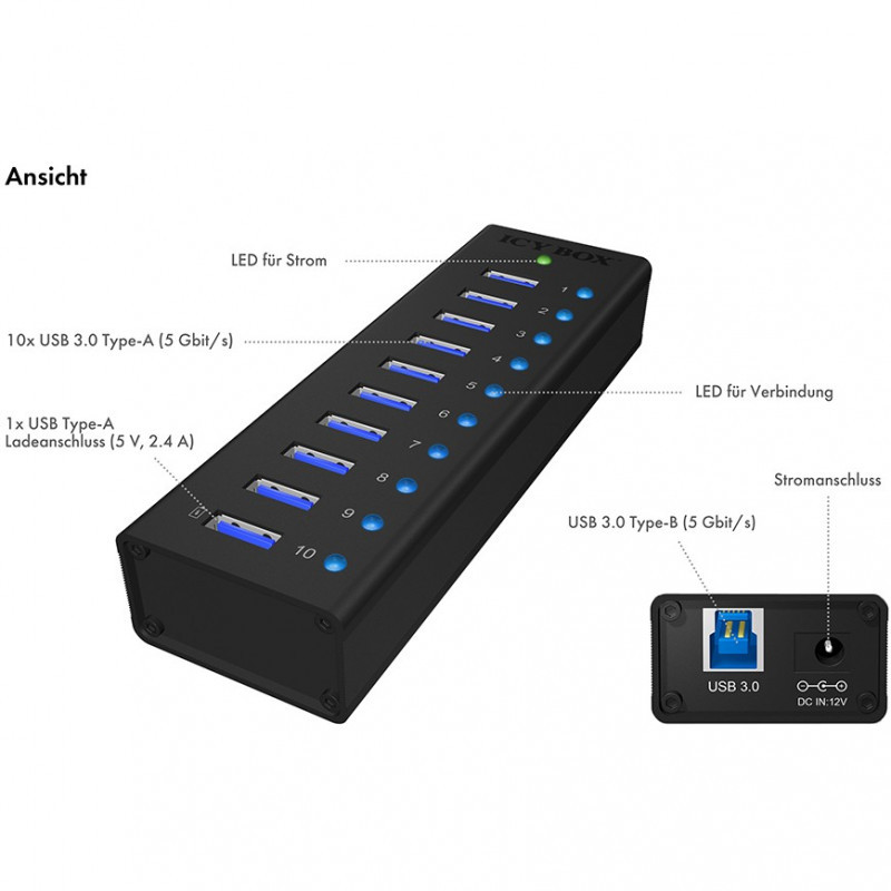 "ICY BOX IB-AC6110. Host interface: USB 3.2 Gen 1 (3.1 Gen 1) Type-B, Hub interfaces: USB 3.2 Gen 1 (3.1 Gen 1) Type-A. Data transfer rate: 5000 Mbit/s, Product colour: Black, Housing material: Aluminium. Power supply type: DC, Input voltage: 100 - 240 V, Output voltage: 12 V. Width: 145 mm, Depth: 45 mm, Height: 25 mm. Package width: 103 mm, Package depth: 83 mm, Package height: 200 mm"\n"A quick provider