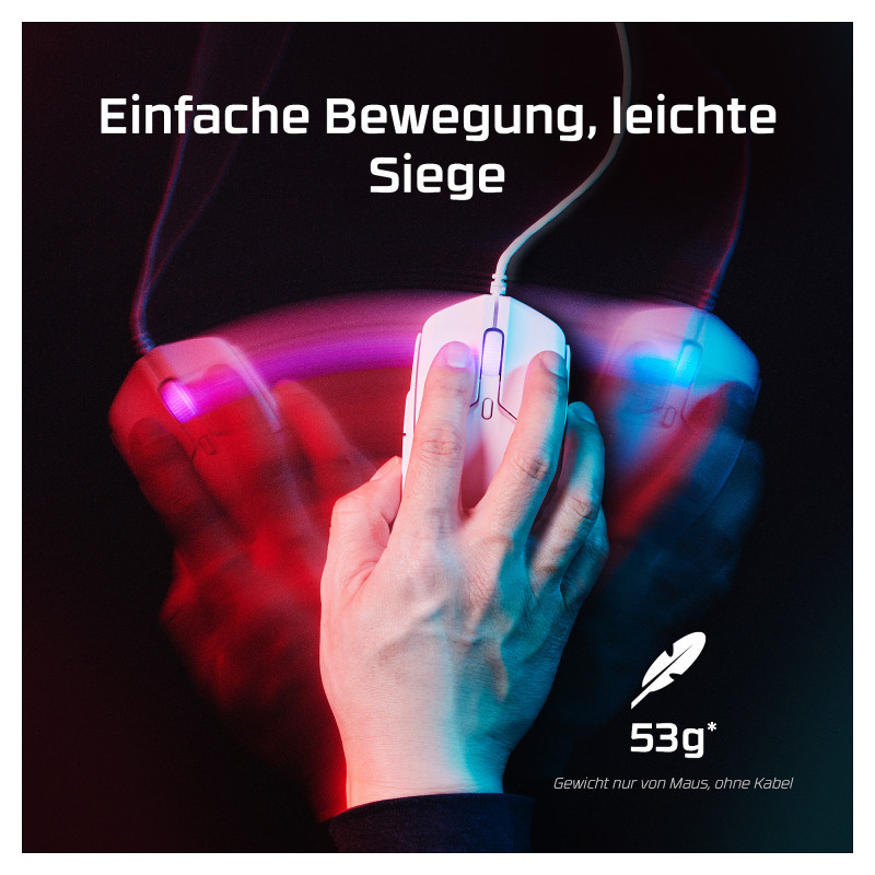 "Pulsefire Haste 2 - Gaming Mouse (White). Form factor: Ambidextrous. Device interface: USB Type-A, Movement resolution: 26000 DPI, Buttons type: Pressed buttons, Buttons quantity: 6, Scroll type: Wheel, Acceleration (max): 50 G. Power source: Cable. Product colour: White"\n"Game at the speed of ultra-light.