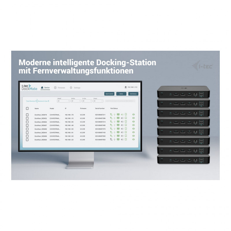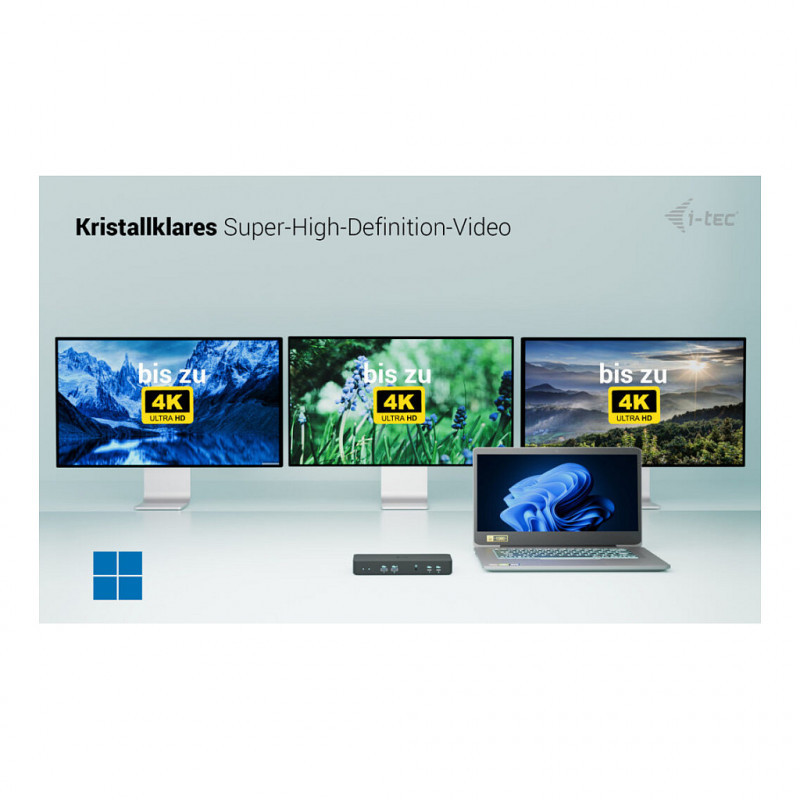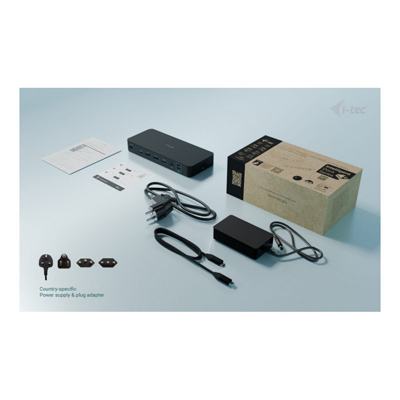 "i-tec USB-C Intelligent Triple Display Docking Station + Power Delivery 100W. Connectivity technology: Wired, Host interface: USB 3.2 Gen 1 (3.1 Gen 1) Type-C, USB Power Delivery up to: 100 W. Ethernet LAN data rates: 10,100,1000 Mbit/s. Product colour: Black, Data transfer rate: 10 Gbit/s, Maximum refresh rate: 360 Hz. Power supply: 135 W, Output voltage: 20 V, Output current: 6.75 A. Mobile operating systems supported: Android, iPadOS, Other operating systems supported: ChromeOS"\n"Experience a breakthrough in docking technology with a high-performance, universal docking station designed for full remote management. Thanks to its dedicated LAN port, IT administrators can control the dock from anywhere — even down to individual port-level management. The remote management software is available as an optional add-on and can be purchased at any time. Of course, the docking station operates at full functionality even without it; the only limitation is the absence of remote management features. And best of all – Manageability works without a host connection — just power and LAN required.