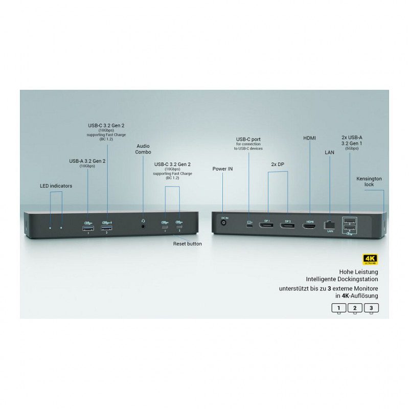A high-performance, new generation USB-C docking station that supports output to up to three external monitors in up to 4K high resolution. The dock can be used with virtually all notebooks equipped with USB-C, USB4 and Thunderbolt” 3/4/5 ports, while supporting all common current operating systems.