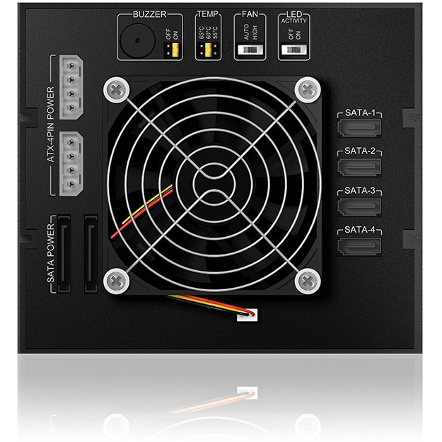 Up to four 3.5"" SATA/SAS HDDs find a home in this backplane. Not even SAS hard disks have to stay out in the cold. Optical and auditory signals alert regarding the HDD and fan state. The temperature alarm signal can be set on three possibilities - 55° C, 60° C, 65° C."