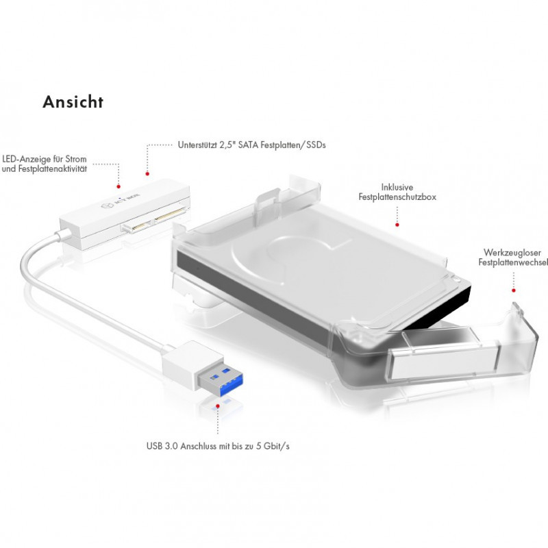 "ICY BOX IB-AC703-U3. Product type: HDD/SSD enclosure. Number of storage drives supported: 1, Storage drive size: 2.5"", Supported storage drive interfaces: Serial ATA III. Data transfer rate: 5 Gbit/s. Hot-swap. Product colour: White. USB connector type: USB Type-A"\n"ICY BOX IB-AC703-U3 for a 2.5"" SATA HDD or SSD consists of an adapter SATA III to USB 3.0 and a plastic enclosure. You can use them separately or together. Use the USB 3.0 interface to connect the adapter directly to a computer, multi media player or the like and your data transfer can reach up to 5 Gbit/s.
