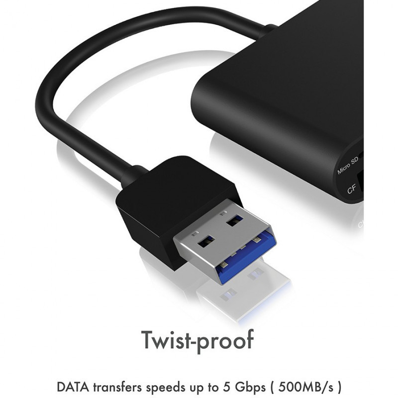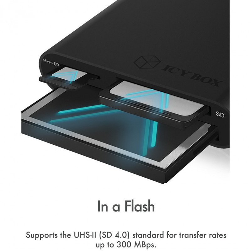 "ICY BOX IB-CR301-U3. Compatible memory cards: CF, MicroSD (TransFlash), SD, SDHC, SDXC, Product colour: Black, Data transfer rate: 5000 Mbit/s. Interface: USB 3.2 Gen 1 (3.1 Gen 1). Width: 44 mm, Depth: 55 mm, Height: 12 mm. Package width: 100 mm, Package depth: 25 mm, Package height: 200 mm. Products per master (outer) case: 60 pc(s)"\n"Choose your card