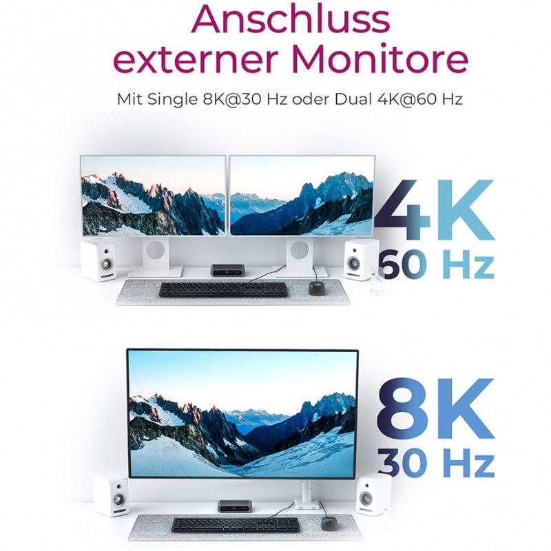 The IB-HUB801-TB4 supports up to two 4K displays at 60 Hz in extended or mirrored mode, a single 8K display at 30 Hz or a 5K Thunderbolt™ display at 60 Hz. When external high-speed storage is connected, you get read speeds of up to 3000 MB/s.