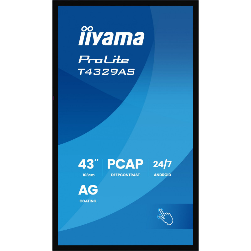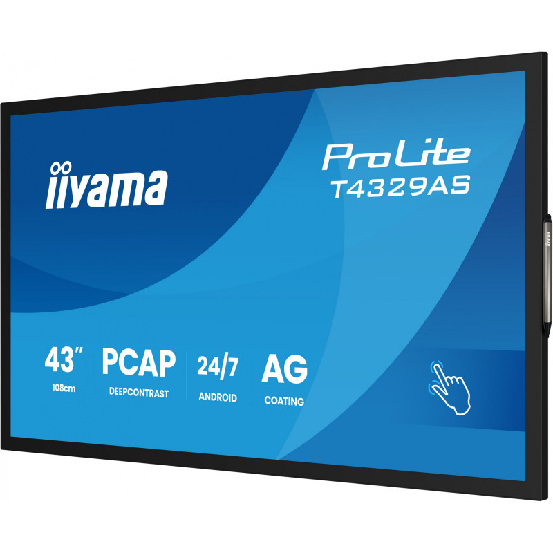 "iiyama T4329AS-B1AG. Display diagonal: 108 cm (42.5""), Display resolution: 3840 x 2160 pixels, HD type: 4K Ultra HD, Display technology: LED, Response time: 6.5 ms, Native aspect ratio: 16:9, Viewing angle, horizontal: 178°, Viewing angle, vertical: 178°. Built-in speaker(s). VESA mounting. Product colour: Black"\n"The ProLite T4329AS-B1AG is a 43"" all-in-one PCAP touchscreen display built for the evolving needs of modern workspaces, especially huddle spaces where creativity, flexibility, and seamless sharing take center stage. Powered by Android OS, this interactive display delivers a user-friendly and highly adaptable experience. You can install your preferred apps directly on the device, enabling customized workflows tailored to your environment — whether in a collaborative meeting area, an enterprise innovation hub, or an educational breakout room. The USB-C loop-through feature simplifies connectivity by allowing multiple displays to be easily daisy-chained while transmitting power, data, and video — all through a single cable. This reduces cable clutter and setup time, making it ideal for dynamic workspaces. The included wall mounting bracket makes installation straightforward and secure. With iiSignage² (CMS), iiControl (DMS), and iiShare (Wireless Presentation) you gain full control over content and messaging, even remotely — perfect for updating shared information or branded visuals on the fly. The integrated EShare app brings wireless screen sharing and collaboration to life, supporting multi-user interaction and real-time ideation. The T4329AS-B1AG isn’t just a display — it’s a collaboration tool designed to empower teams, streamline communication, and make every meeting count."