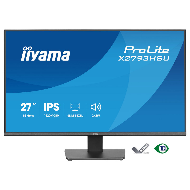"iiyama ProLite X2793HSU-B1. Display diagonal: 68.6 cm (27""), Display resolution: 1920 x 1080 pixels, HD type: Full HD, Display technology: LED, Display surface: Matt, Response time: 1 ms, Native aspect ratio: 16:9, Viewing angle, horizontal: 178°, Viewing angle, vertical: 178°. Built-in speaker(s). Built-in USB hub, USB hub version: 2.0. VESA mounting. Product colour: Black"\n"The ProLite X2793HSU is perfect if you need a compact, high-performance monitor that fits seamlessly into a multi-screen workspace. The four-side ultra-slim bezel design gives you a clean, modern desk setup and uninterrupted viewing across displays. You’ll enjoy sharp detail, vivid colours and wide viewing angles with the IPS panel, while the 120Hz refresh rate keeps everything smooth and responsive. Flicker-free technology and a blue light reducer support your eye comfort during long hours of use. Built-in speakers, a two-port USB hub, HDMI and DisplayPort inputs, and a headphone socket keep your workspace simple and connected. With EPEAT registration, TCO10 compliance and an Energy Label C rating, it’s a smart, sustainable choice that works as hard as you do."