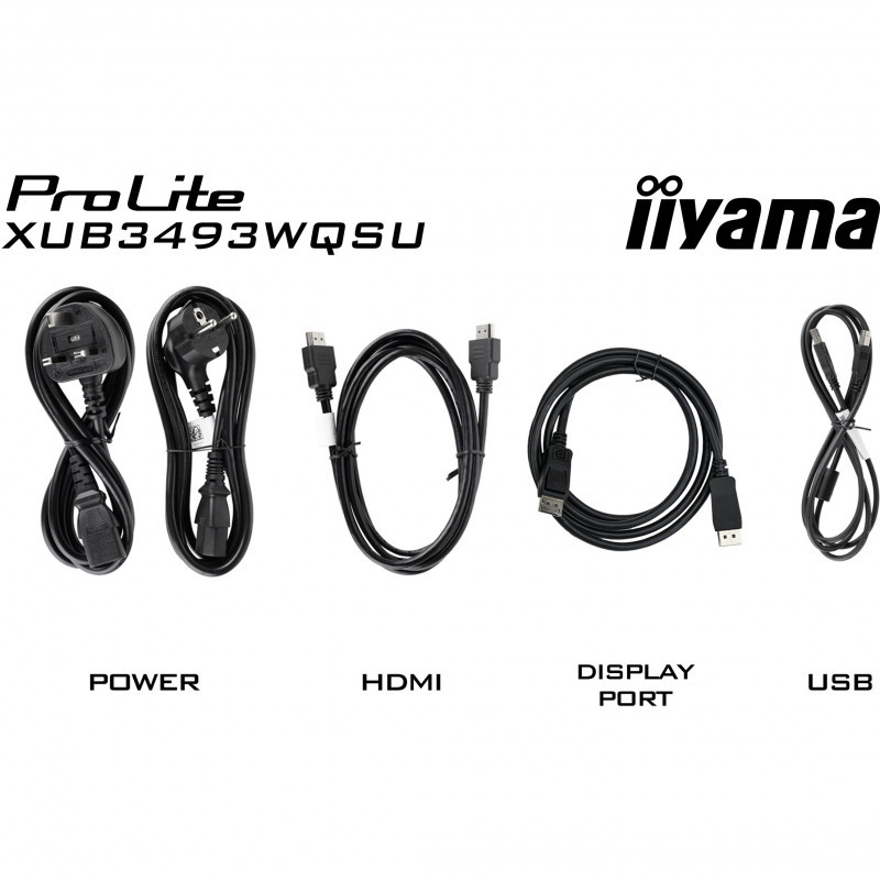 "iiyama ProLite 34” IPS ultra-wide flat screen with PiP, PBP and height adjustable stand. Display diagonal: 86.4 cm (34""), Display resolution: 3440 x 1440 pixels, HD type: UltraWide Quad HD, Display technology: LED, Display surface: Matt, Response time: 1 ms, Native aspect ratio: 21:9, Viewing angle, horizontal: 178°, Viewing angle, vertical: 178°. Built-in speaker(s). Built-in USB hub. VESA mounting, Height adjustment. Product colour: Black"\n"With a 21:9 UWQHD resolution, the ProLite XUB3493WQSU provides an extended desktop space ideal for working with multiple applications side by side. The IPS panel ensures accurate colour reproduction and wide viewing angles, suitable for both detailed work and media consumption. Equipped with Picture-in-Picture (PiP) and Picture-by-Picture (PbP) functionalities, the monitor allows you to display content from two different sources simultaneously. This is especially useful for professionals who need to monitor multiple systems or compare data across devices without the need for a second screen. The 150 mm height-adjustable stand helps you maintain an ergonomic posture, while flicker-free technology and a blue light reducer contribute to reduced eye fatigue. The XUB3493WQSU offers a practical and flexible solution for users who value efficiency, clarity, and comfort."